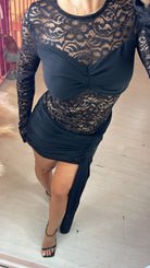 Abito interamente in pizzo con bande di tessuto e fascia drappeggio lunga nella parte frontale