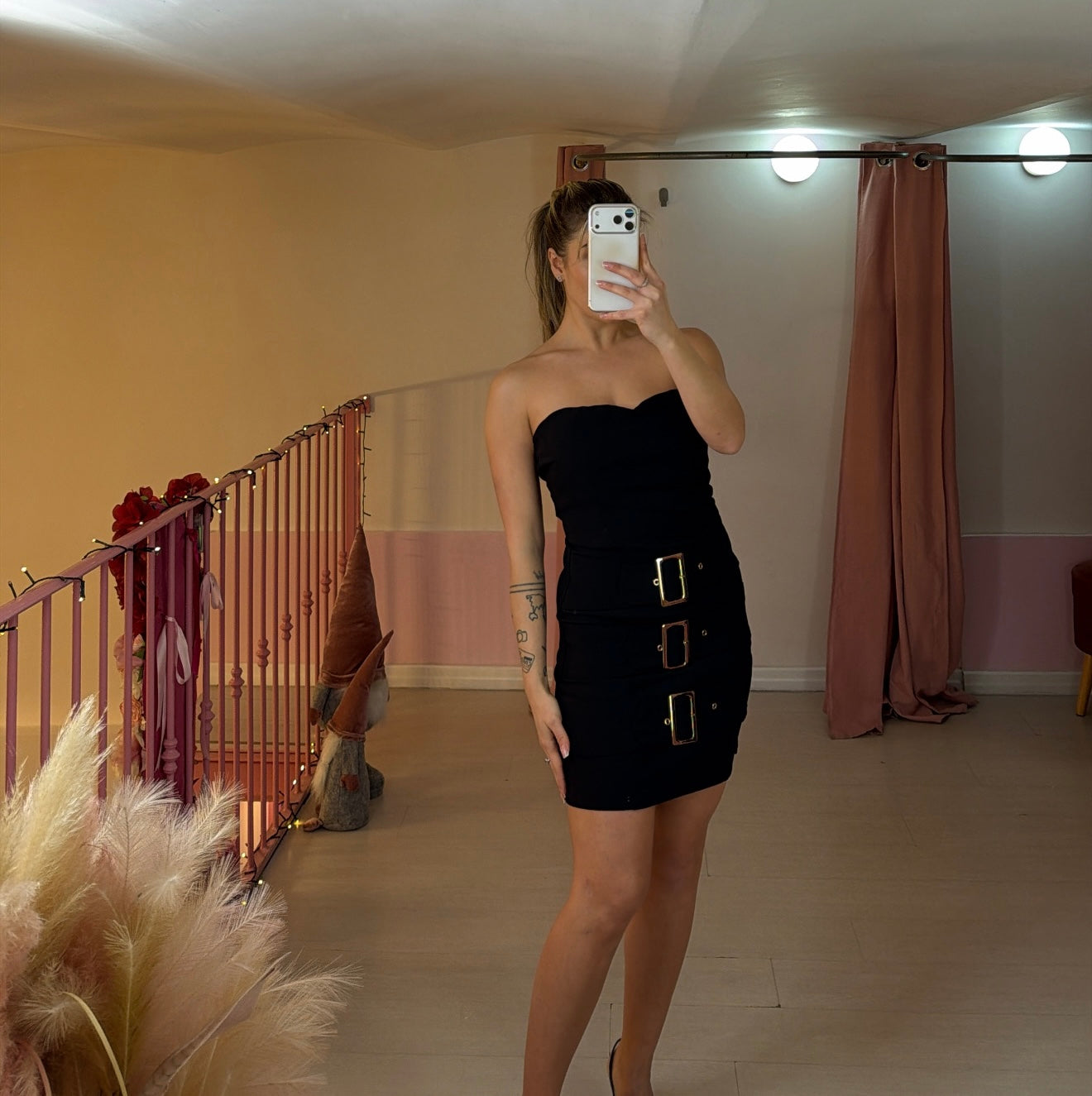 Tubino elasticizzato a fascia con particolare di 3 fibie sul davanti.