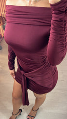 Abito con spalle scoperte risvolto, e banda drappeggio  nella parte avanti.