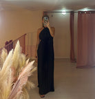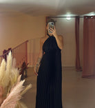 Abito lungo plissettato in satin raso con chiusura laccio al collo regolabile e scollatura schiena