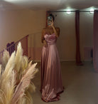 Abito lungo satin raso con gonna morbida e spacco, top con leggero scollo a V e bretellina sottile regolabile