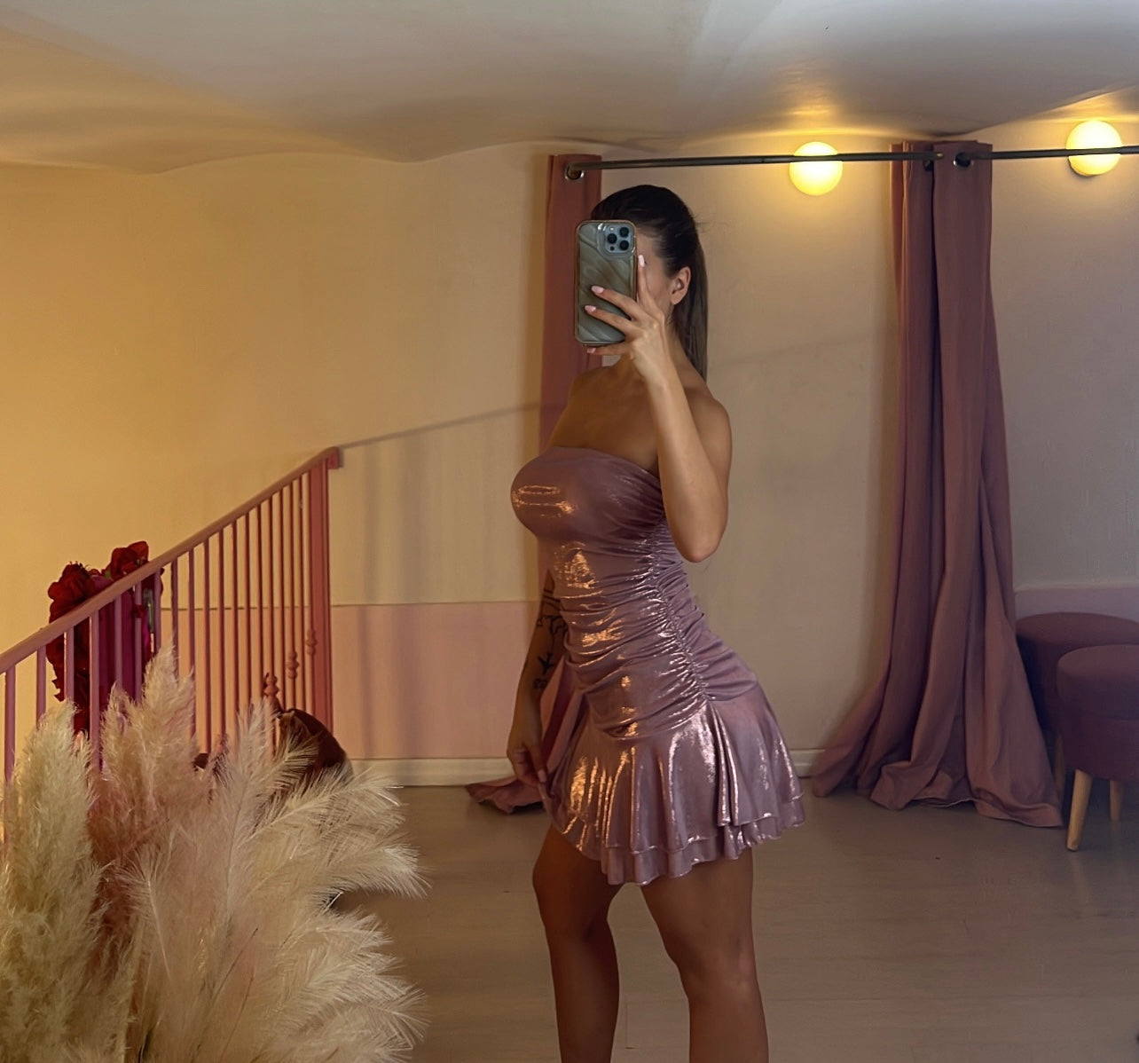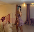 Mini abito aderente con scollo a fascia, dettaglio rouches nella parte finale, particolarità del tessuto effetto laminato