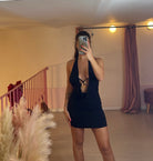 Mini vestito tubino con scollo halter e coulisse seno dettaglio gioiello oro