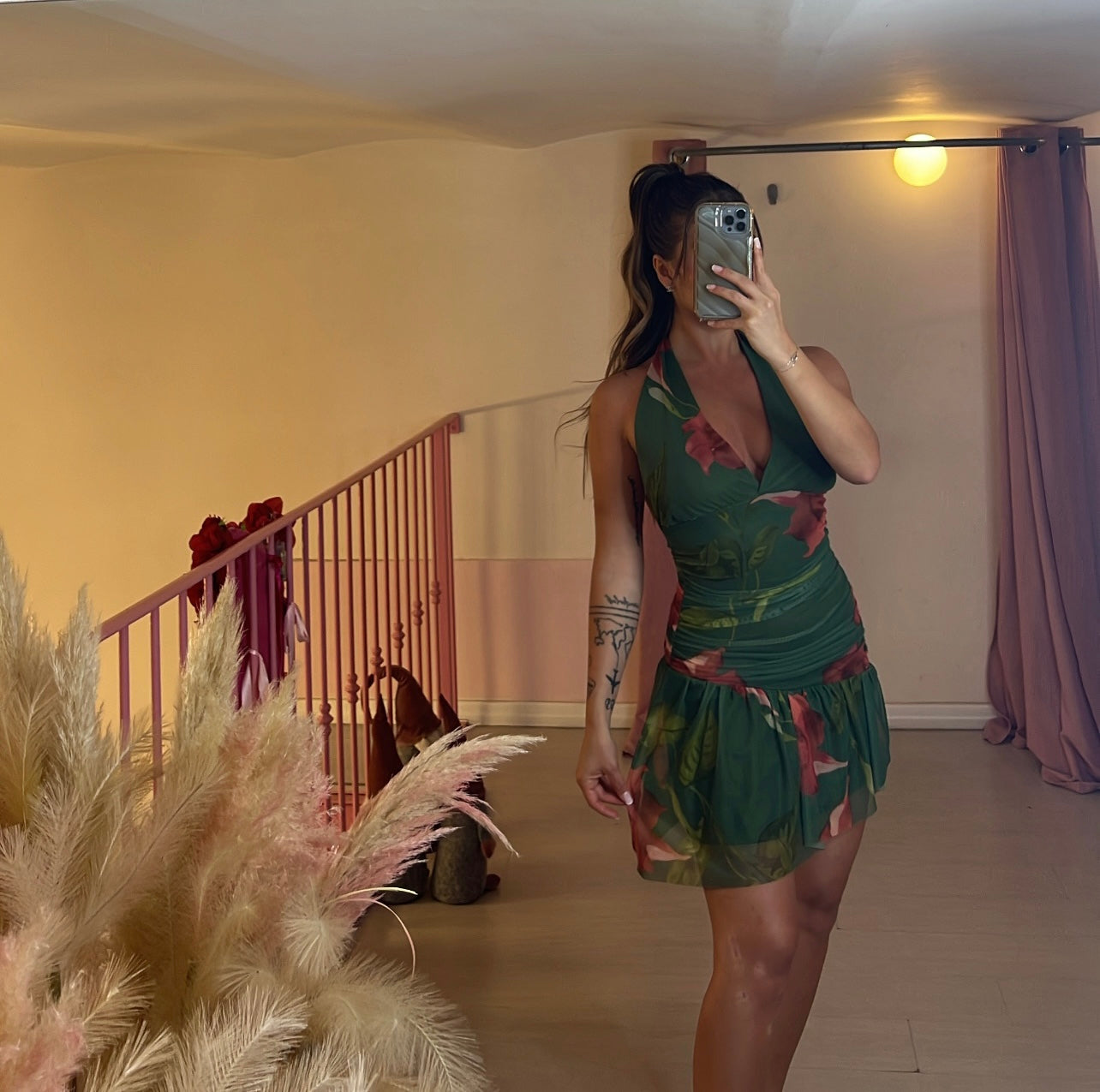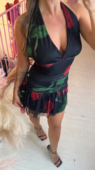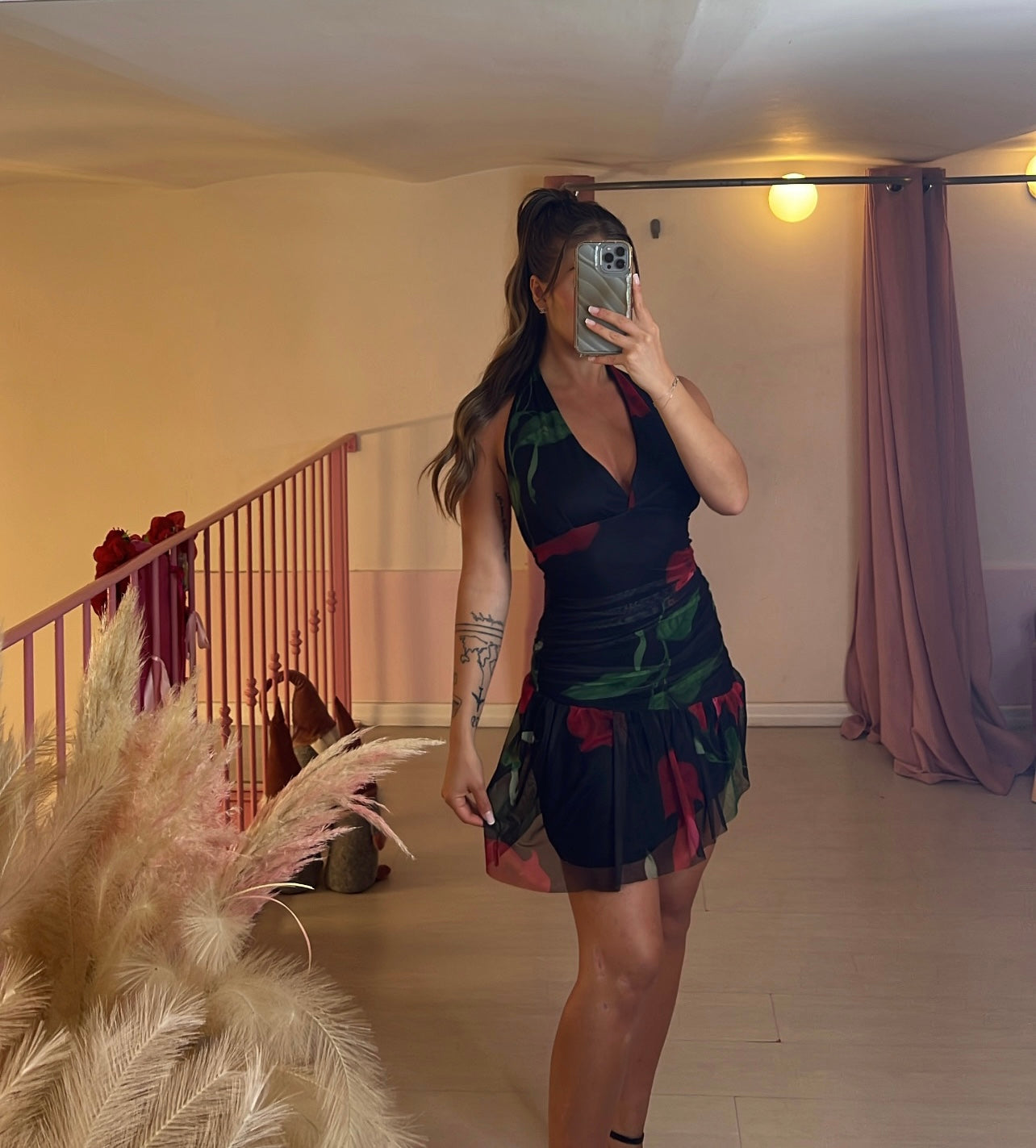 Mini abito in toulle con fantasia rose, scollo profondo nella parte anteriore e dettaglio orlo a balze e drappeggio nella parte inferiore.