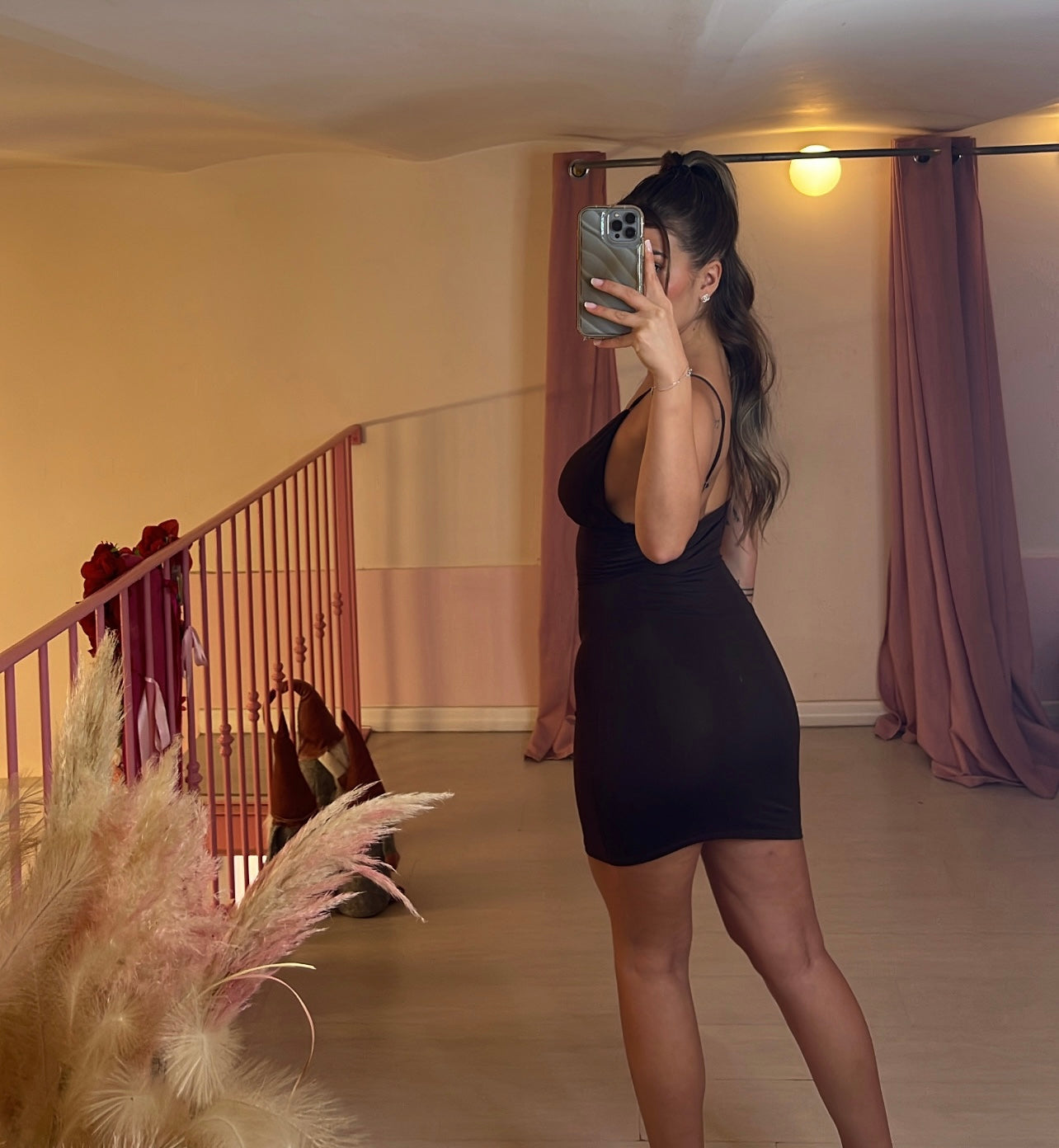 Mini abito a tubino con scollo a V e bretelline regolabili.