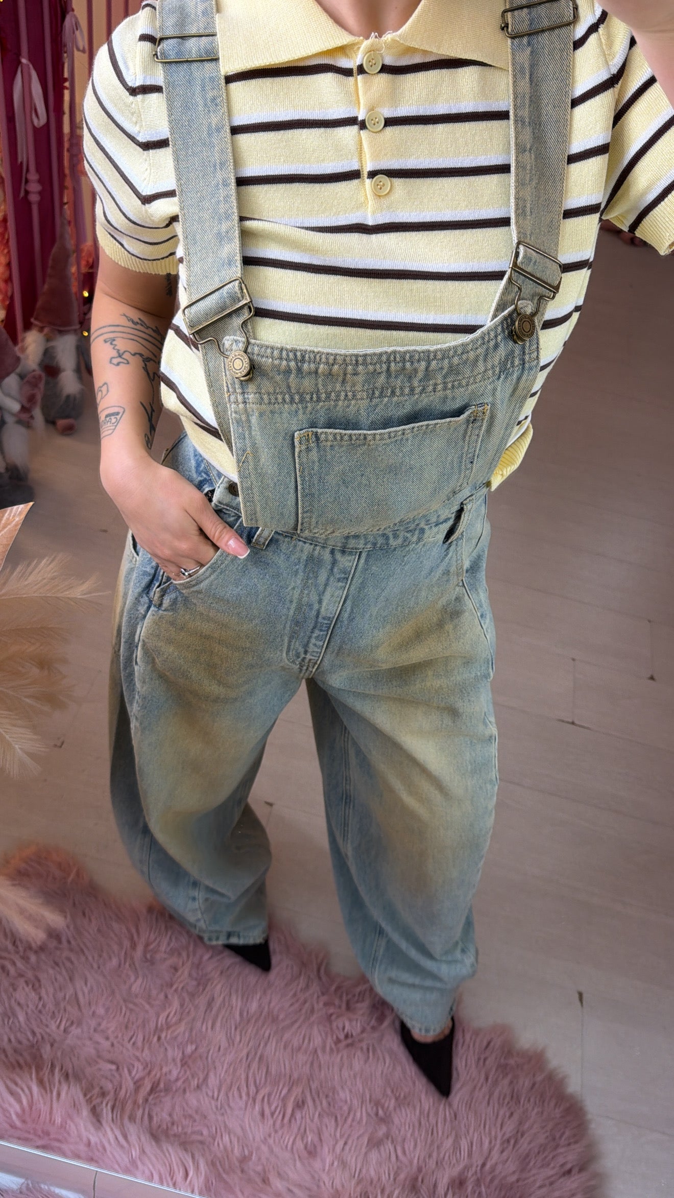 Salopette Baggy in denim lavaggio slavato con spalline regolabili.
