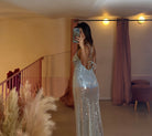 Abito lungo di paillettes con culotte e dettaglio bretelle a incrocio nella parte dietro