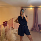 Tutina pantaloncino con spalline imbottite, manica ampia e dettaglio cintina con gioiello.