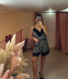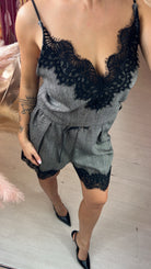 Set in tessuto spigato con dettaglio pizzo canottiera e pantaloncino con elastico in vita e cintina.