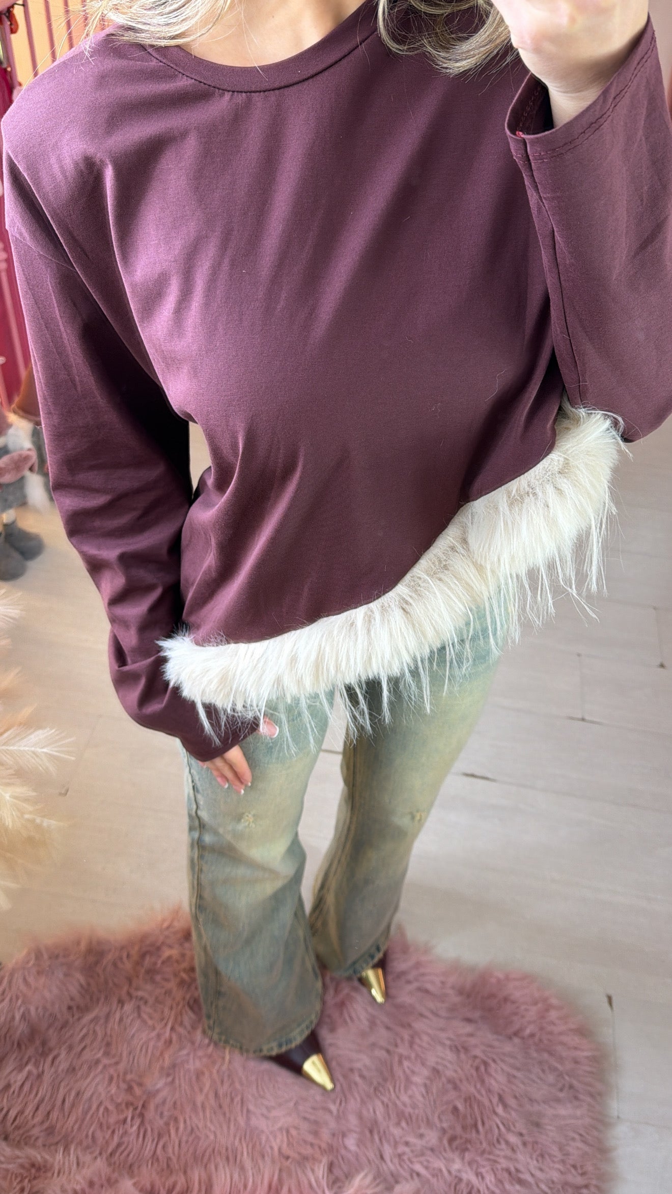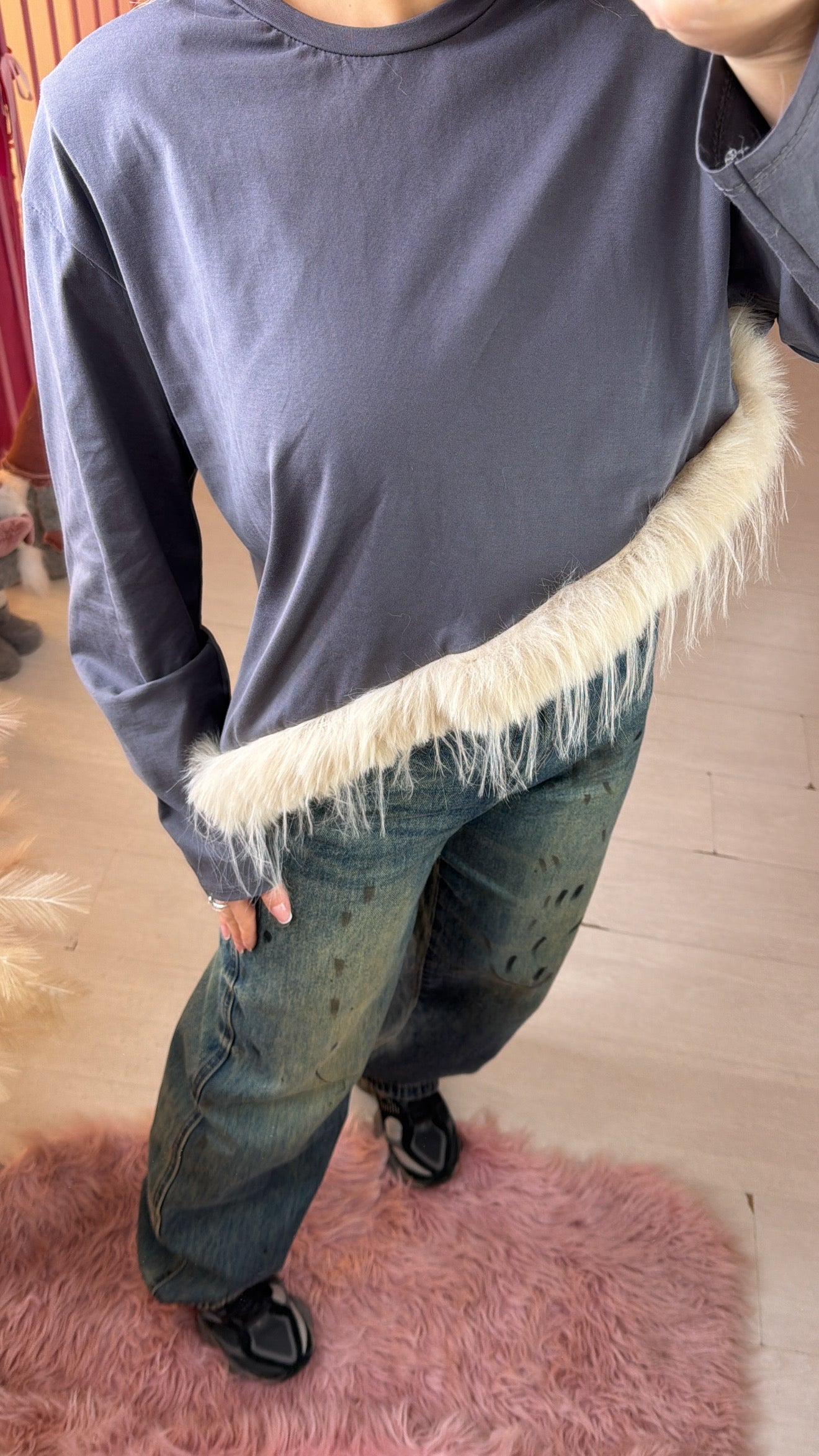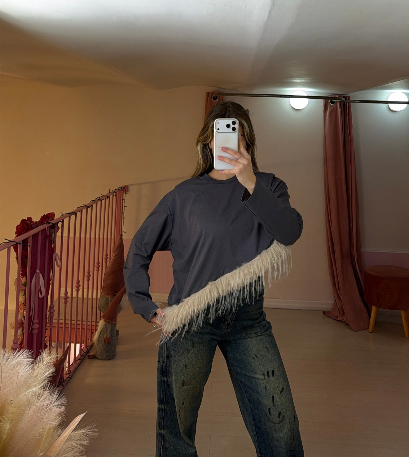 Maglia  girocollo manica lunga taglio asimmetrico con particolare di piume nella parte finale.