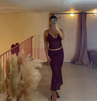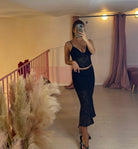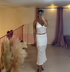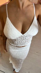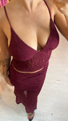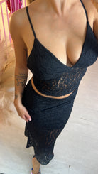 Coordinato composto da top con coppe preformate e bretelline regolabili e gonna longuette in pizzo.
