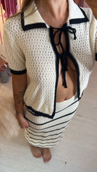 Coordinato in maglia trapuntata formato da giacchetta a maniche corte con chiusura a fiocchetto e gonna longuette a righe.