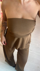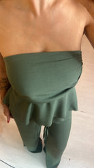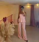 Coordinato formato dal top a fascia con rouches e pantalone a palazzo con elastico in vita