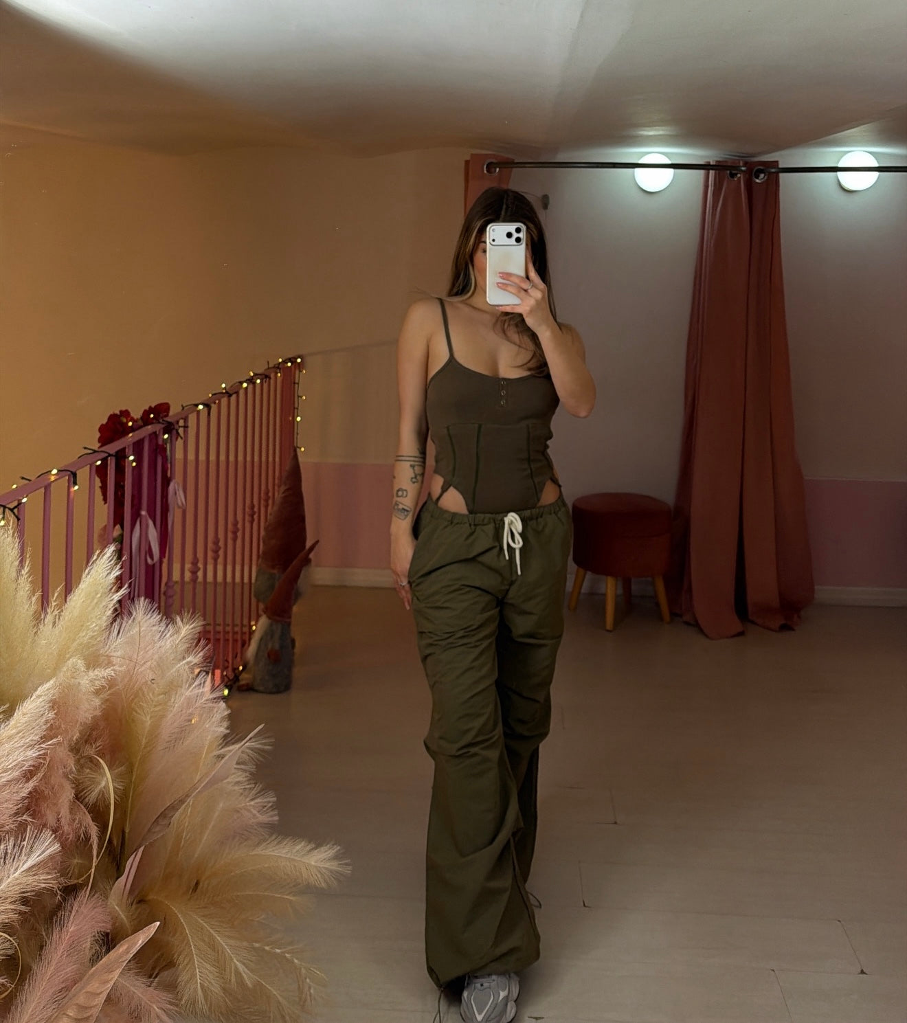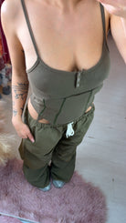 Set colore verde militare con pantalone parachute in tessuto tecnico con coulisse regolabile nella parte della caviglia e Body con bretellina regolabile sgambato .