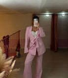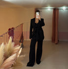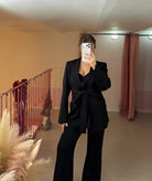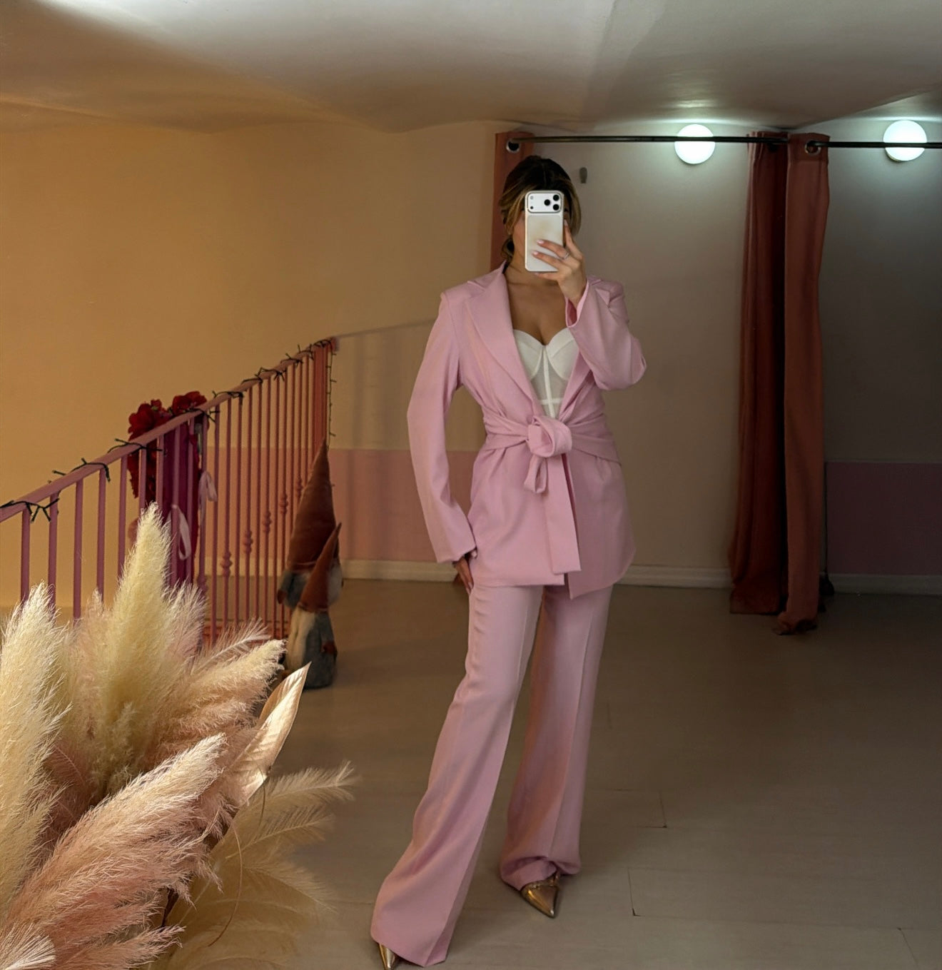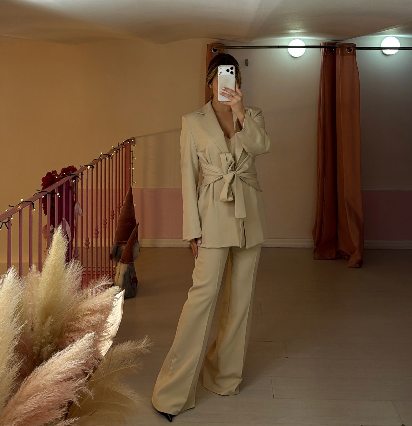 Tailleur formato da giacca con spallina imbottita senza chiusura bottone ma da un grande nastro a fiocco e il pantalone a palazzo con bottone ed elastico in vita.