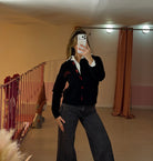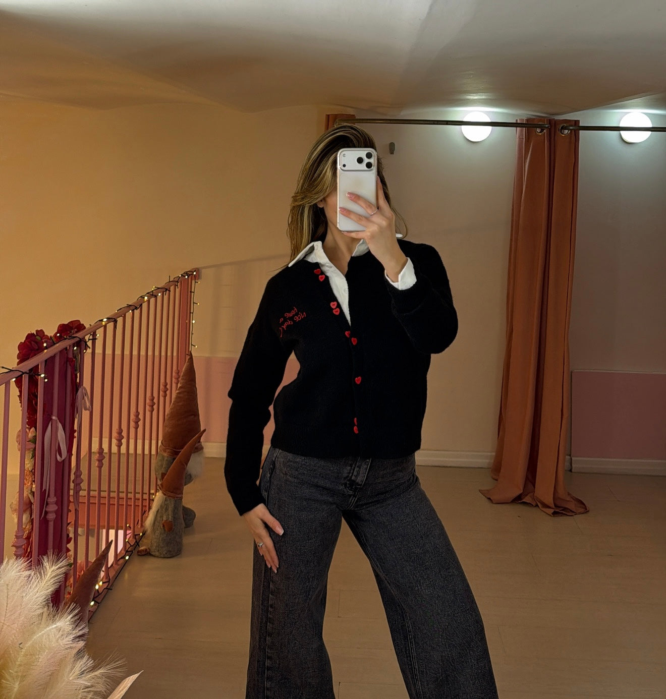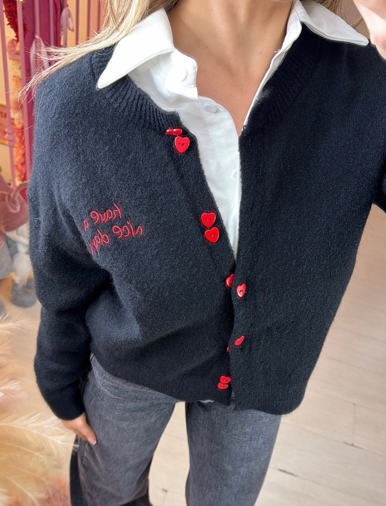 Cardigan con scritta "have a nice day” con bottoni a forma di cuore .