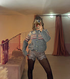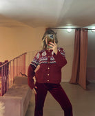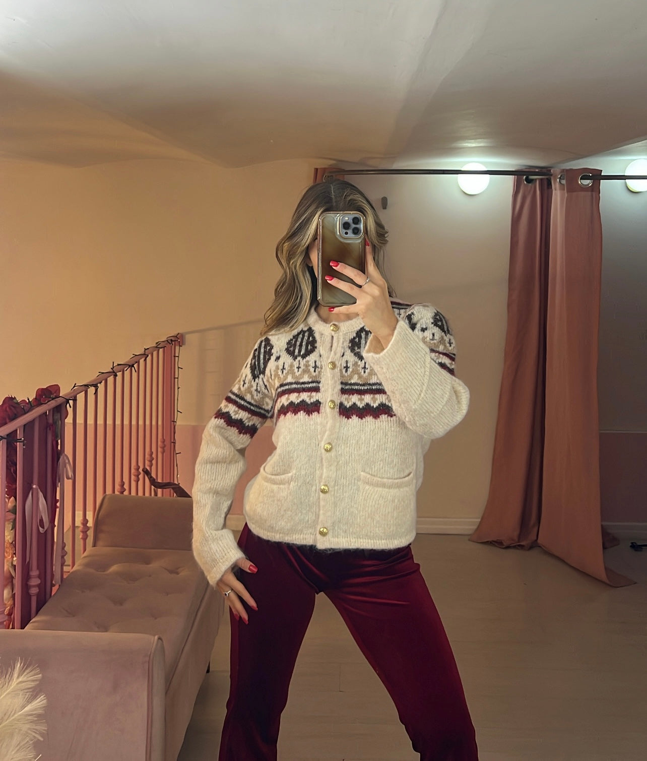 Cardigan natal jacquard apribile con bottoni oro gioiello e tasche frontali ricamate.