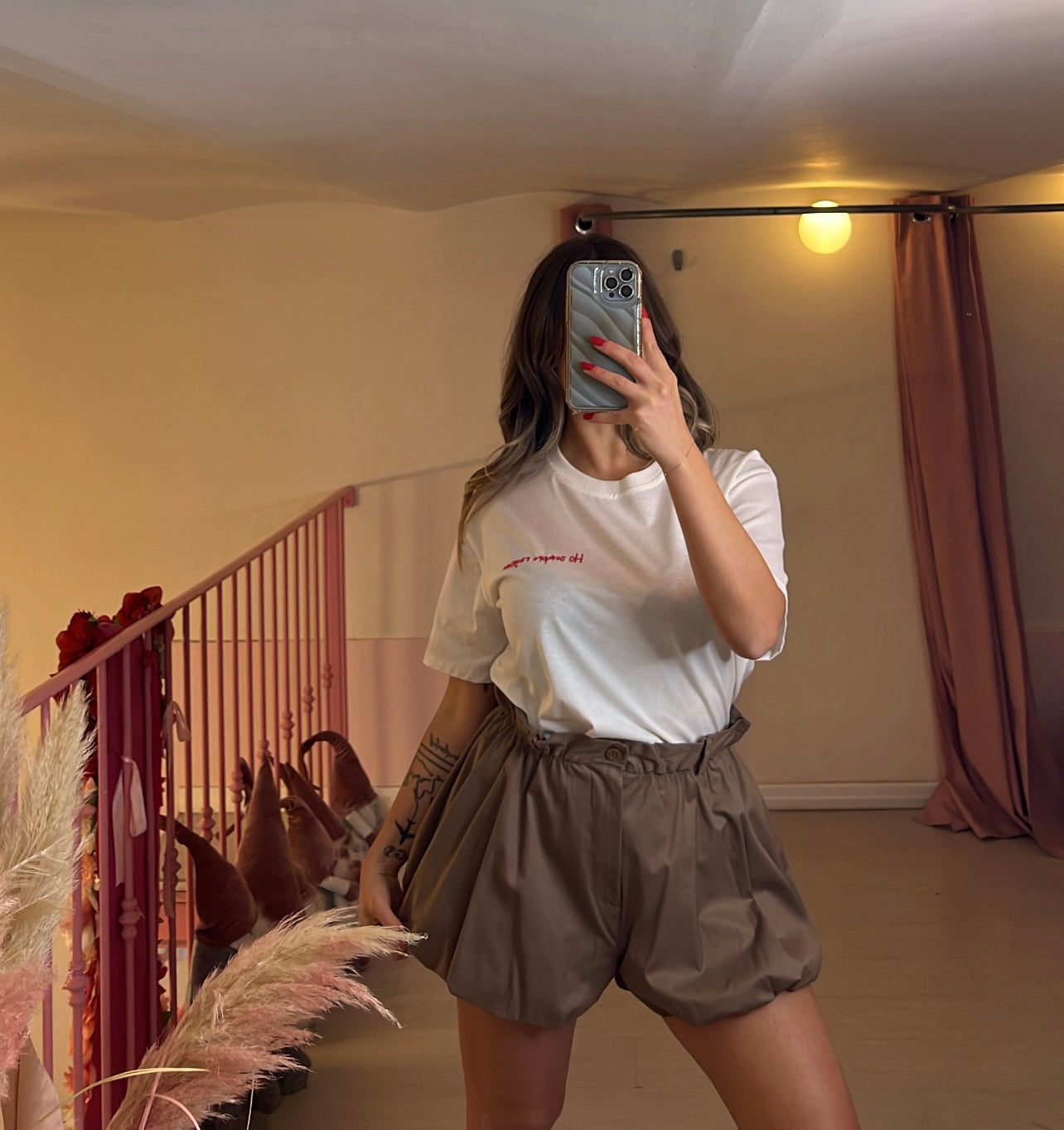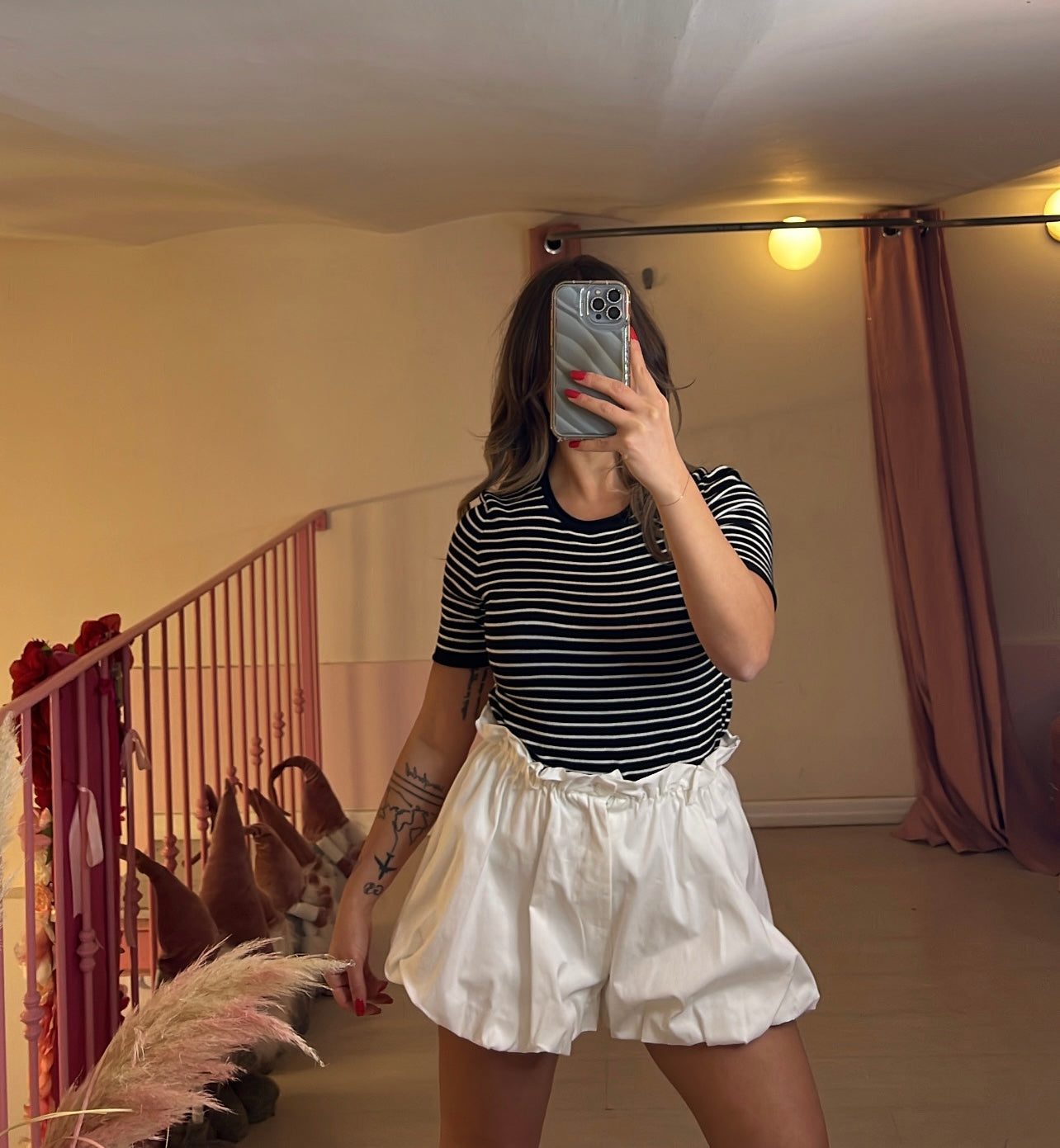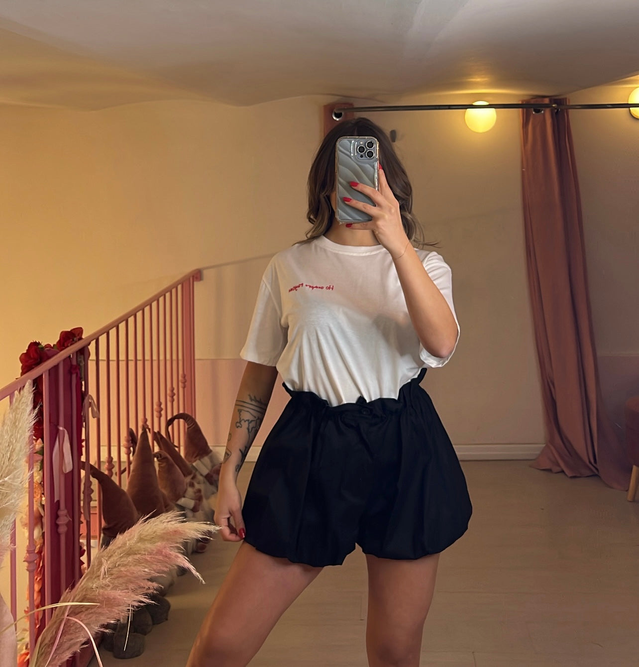 Gonna pantaloncino a palloncino con penz ed elastico in vita. Taglia unica. Veste da una S ad una L.