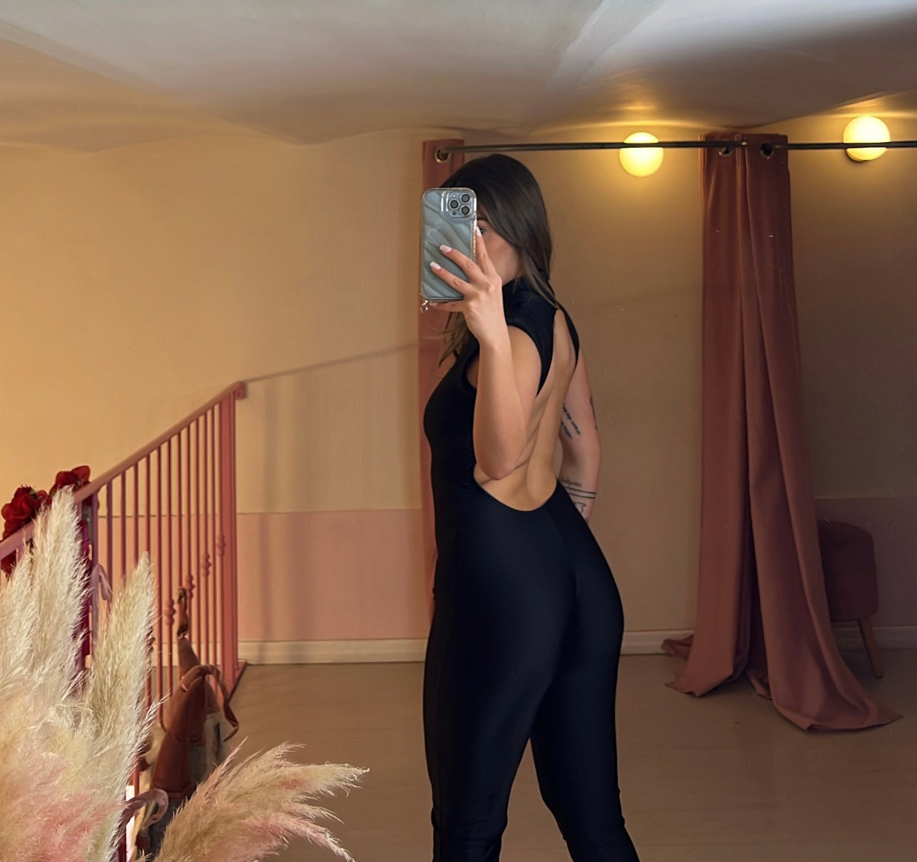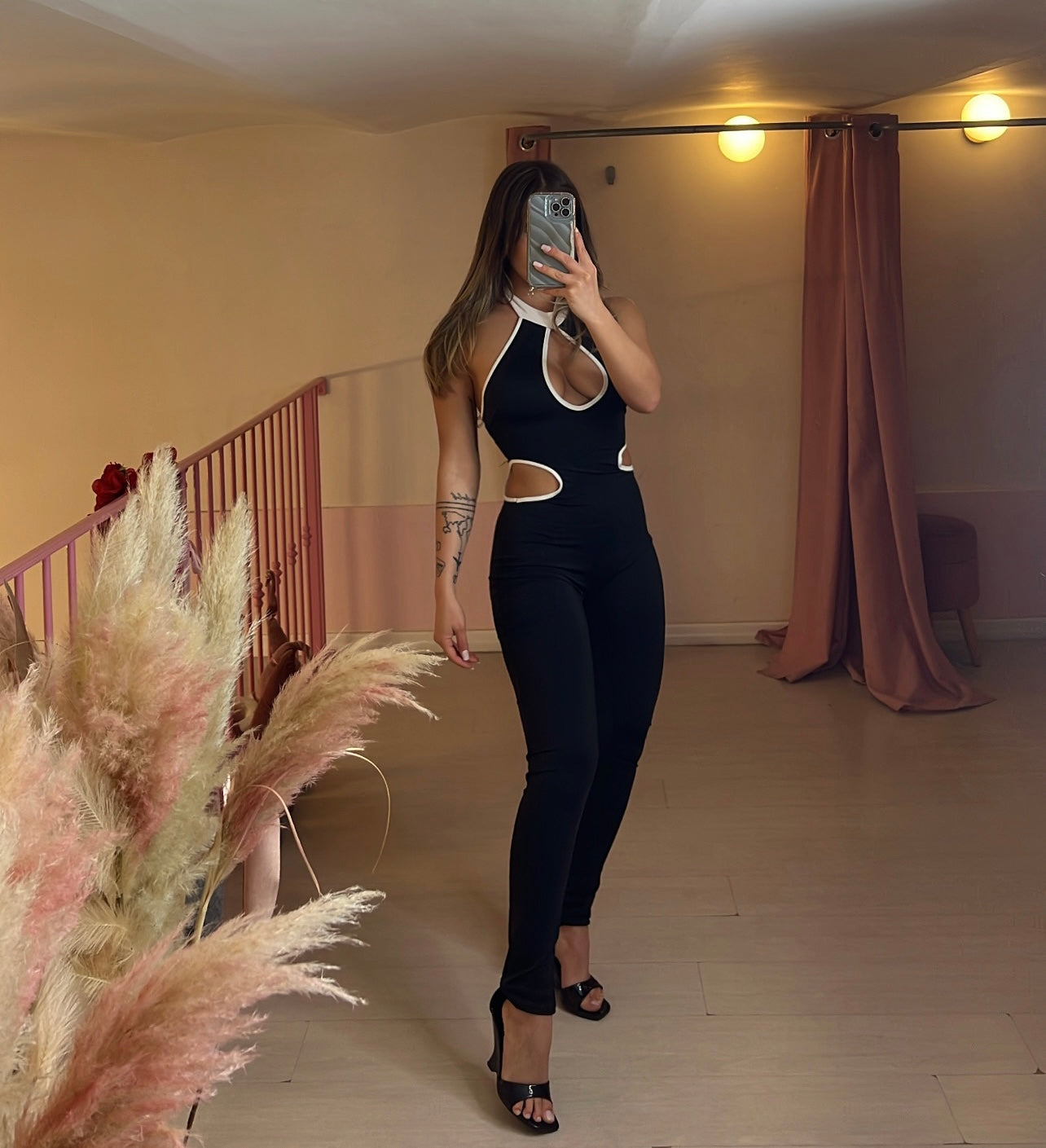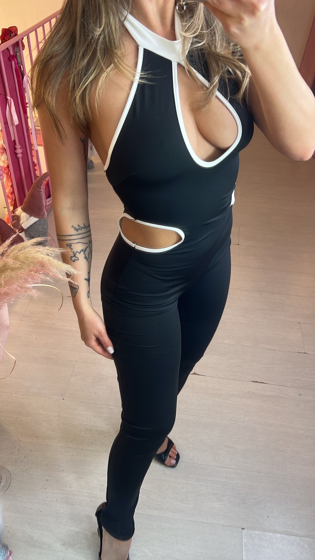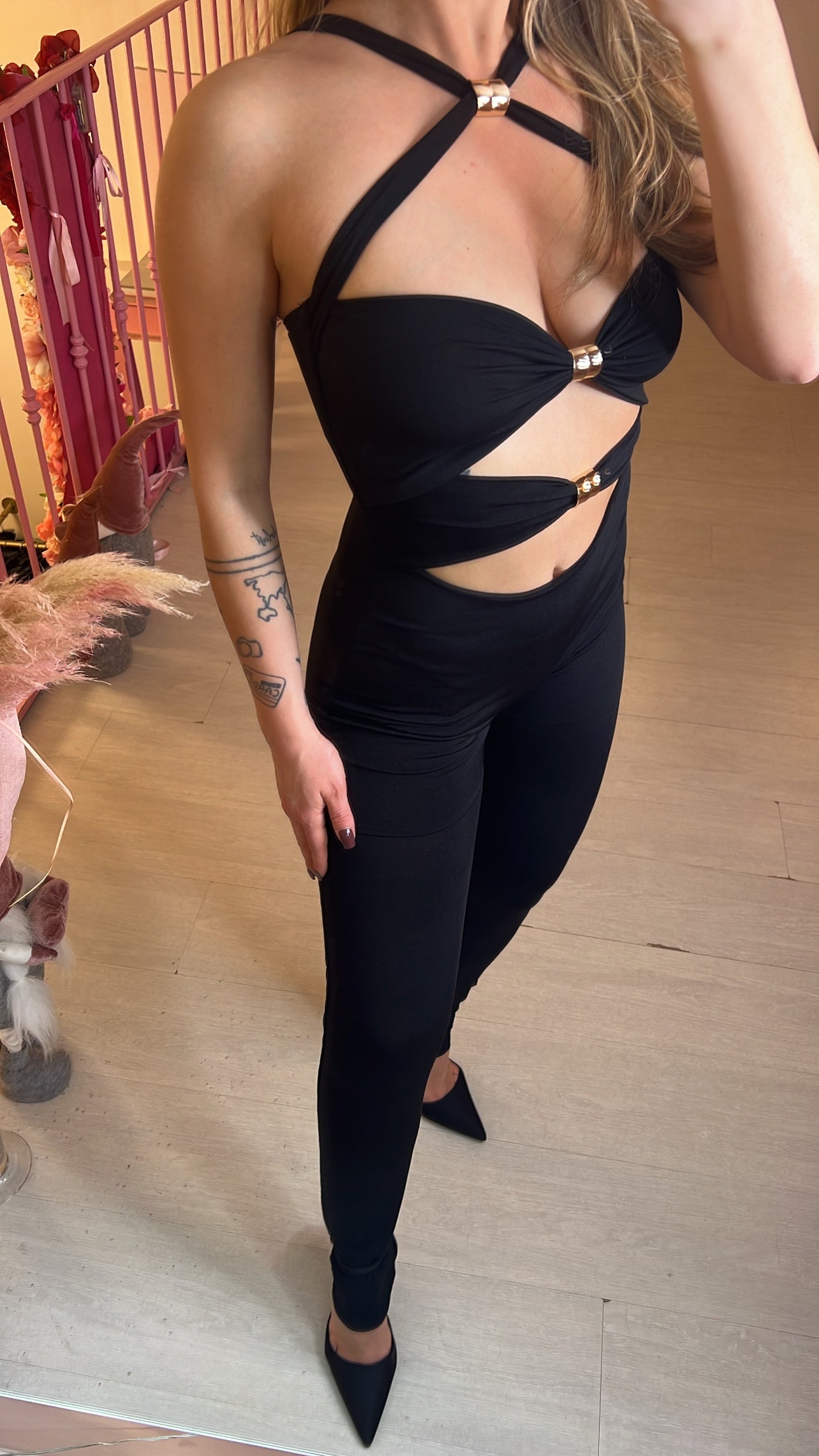 Tutina intera smanicata con aperture davanti e dettagli in oro