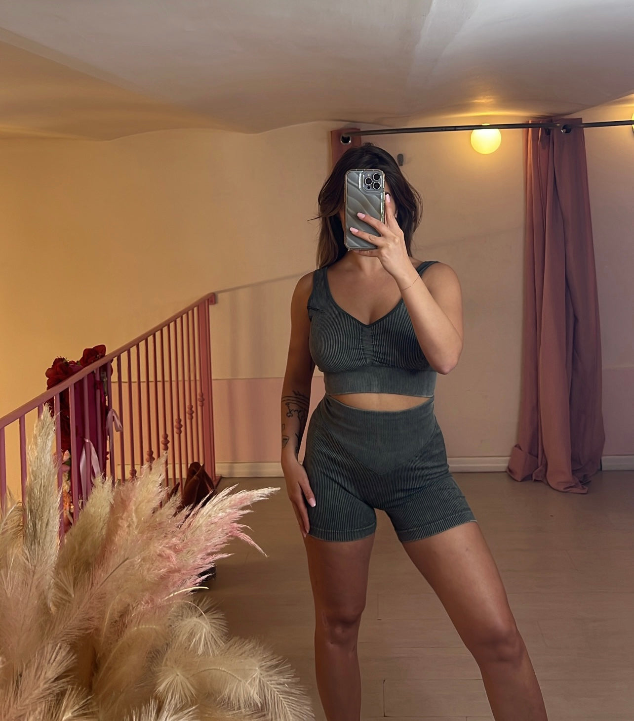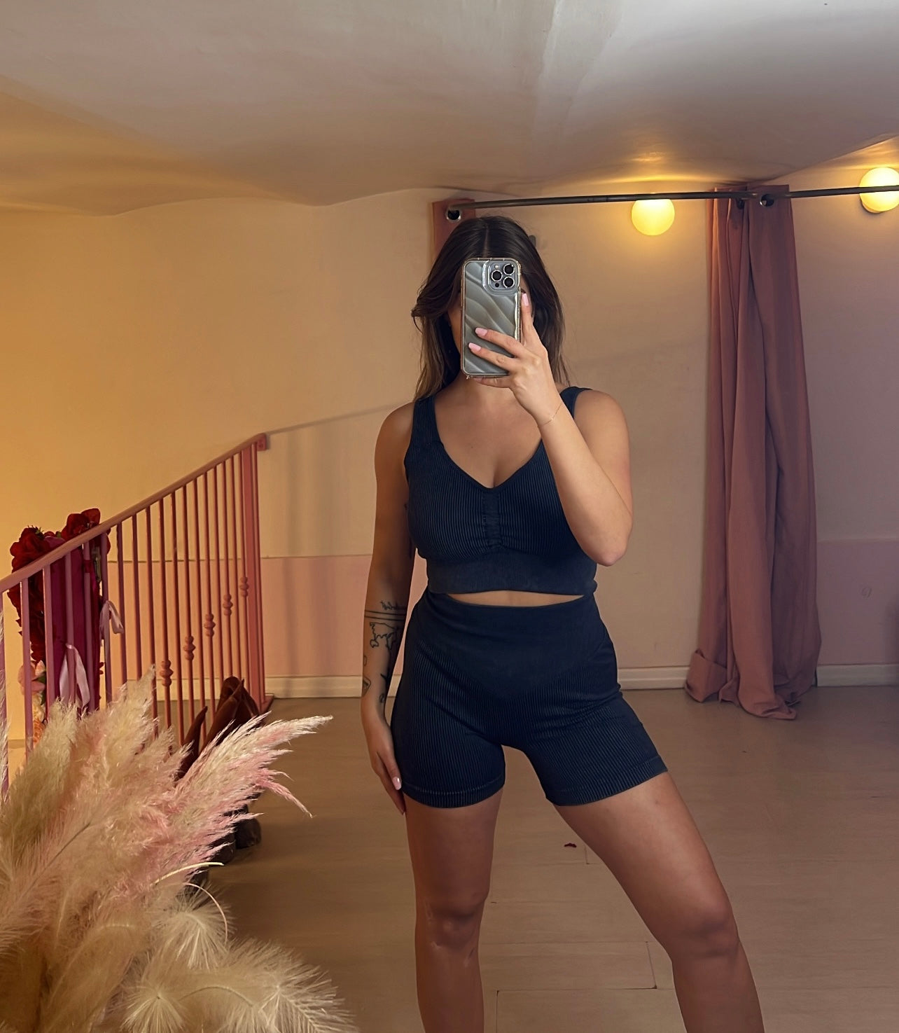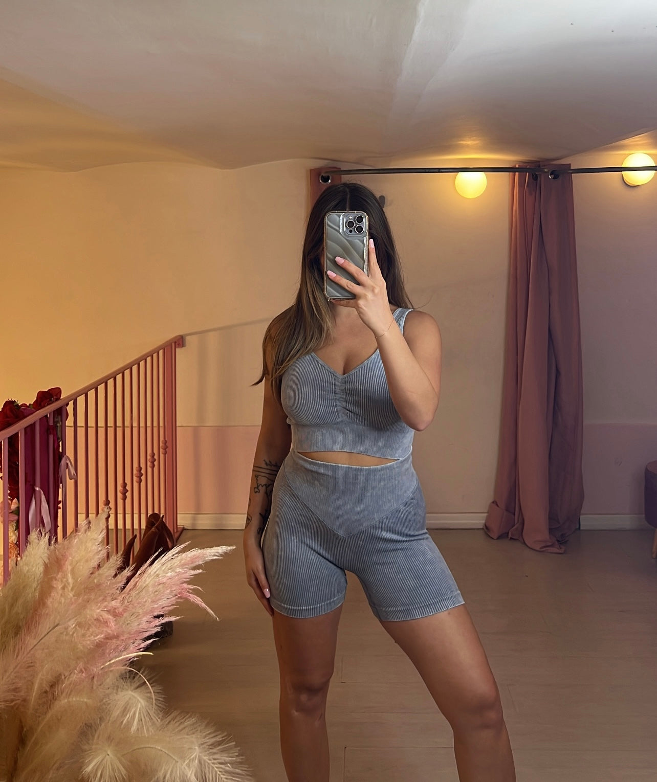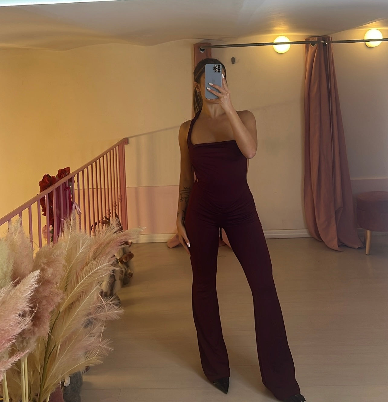 Tutina intera smanicata con aperture davanti e dettagli in oro