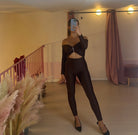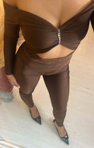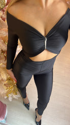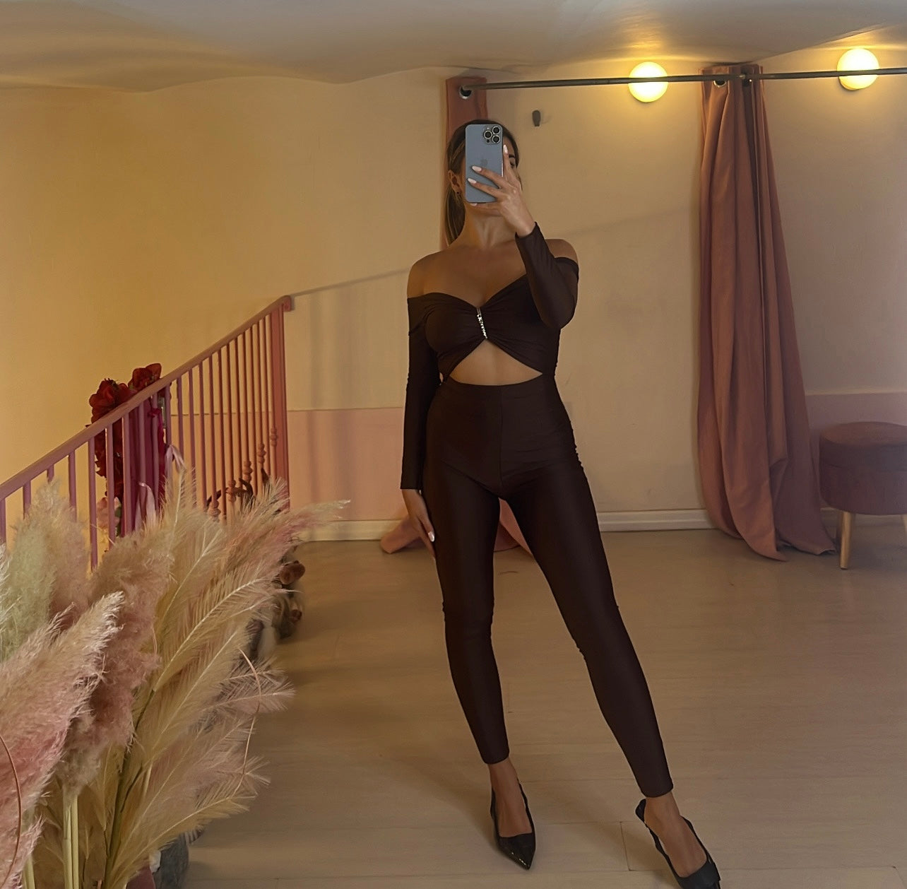 Jumpsuite da donna, maniche lunghe, spilla con strass decorativa removibile sullo scollo, modello aderente.
