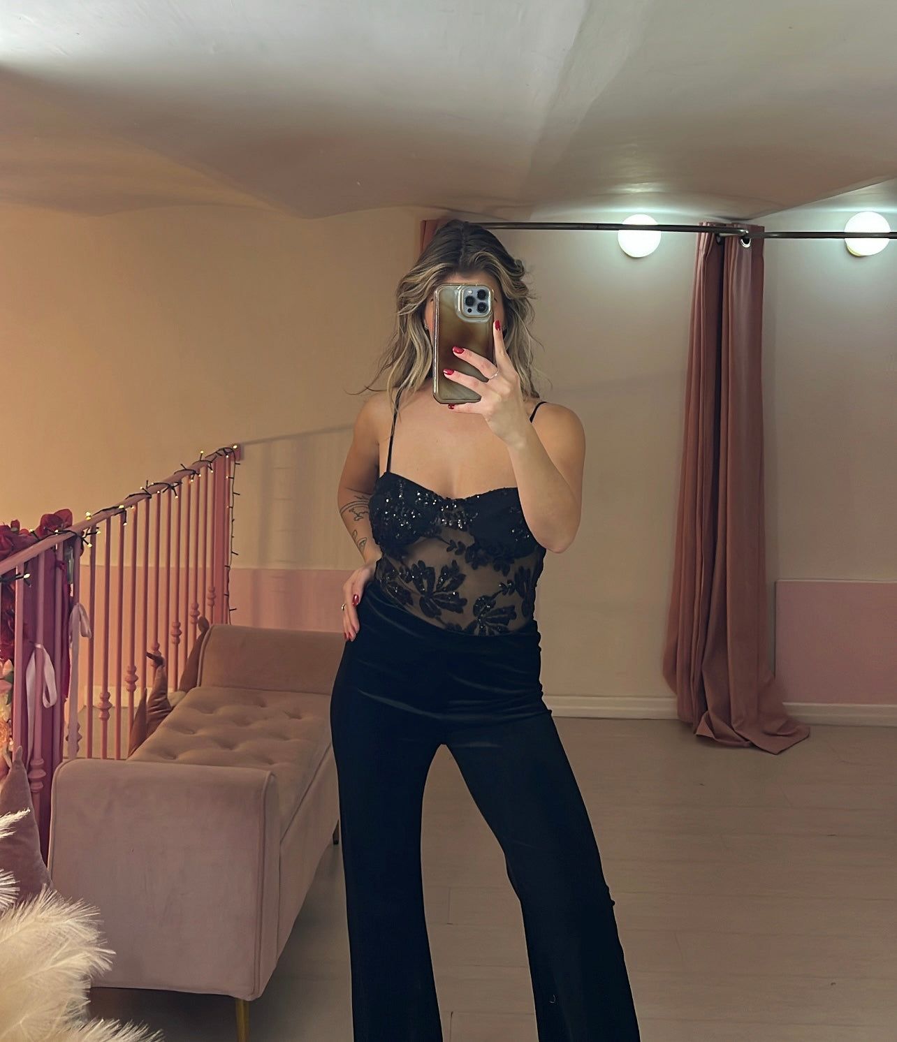 Body trasparente lavorato con paillettes , ha coppe preformate imbottite e bretellina regolabile