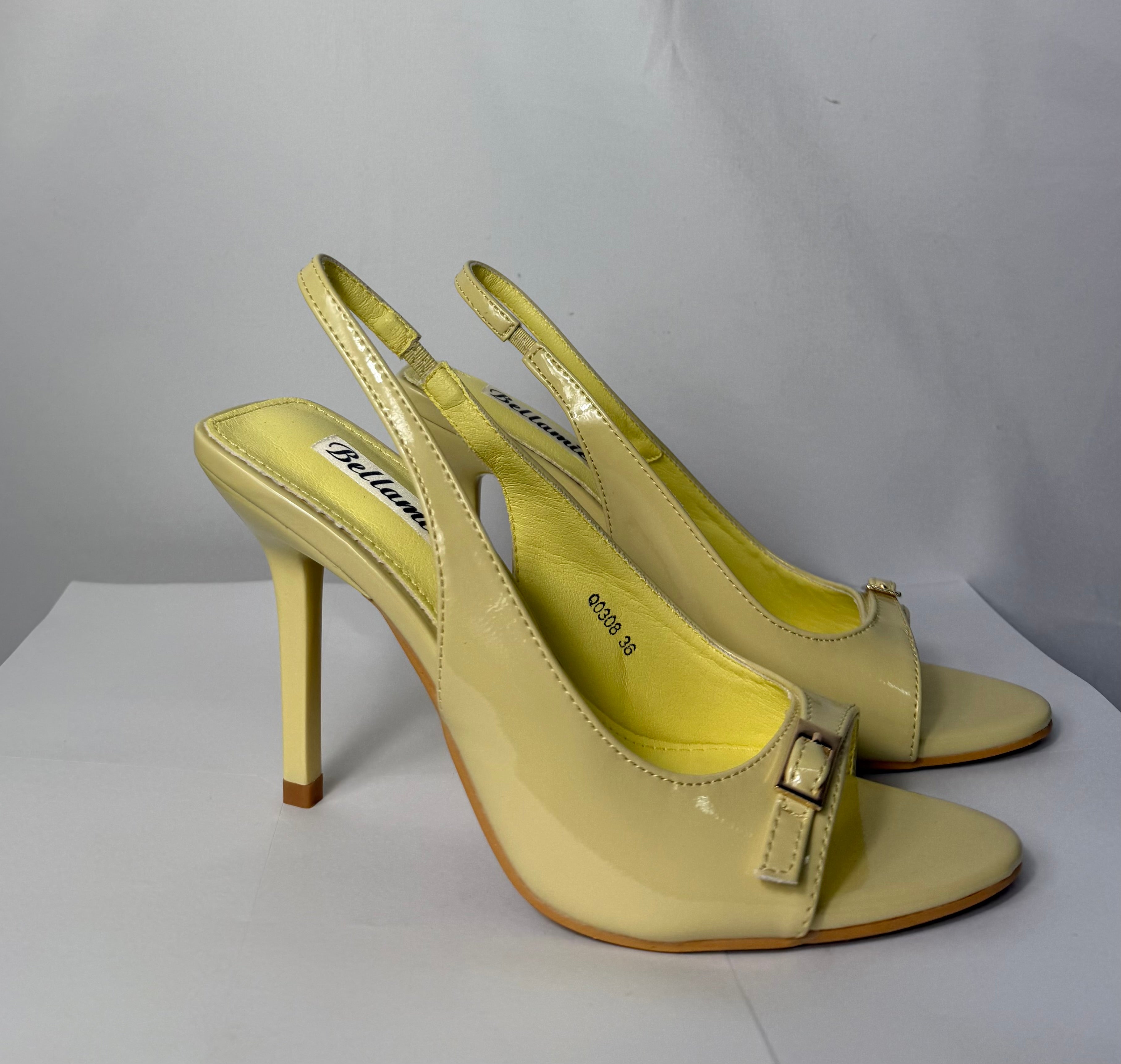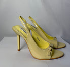 Dècolletè slingbakc gialla laccata aperta davanti e impreziosita da fibbietta, con cinturino posteriore regolabile che lascia il tallone scoperto