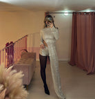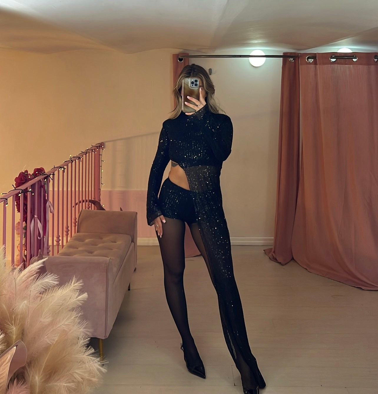 Top asimmetrico in paillettes manica lunga con spallina imbottita