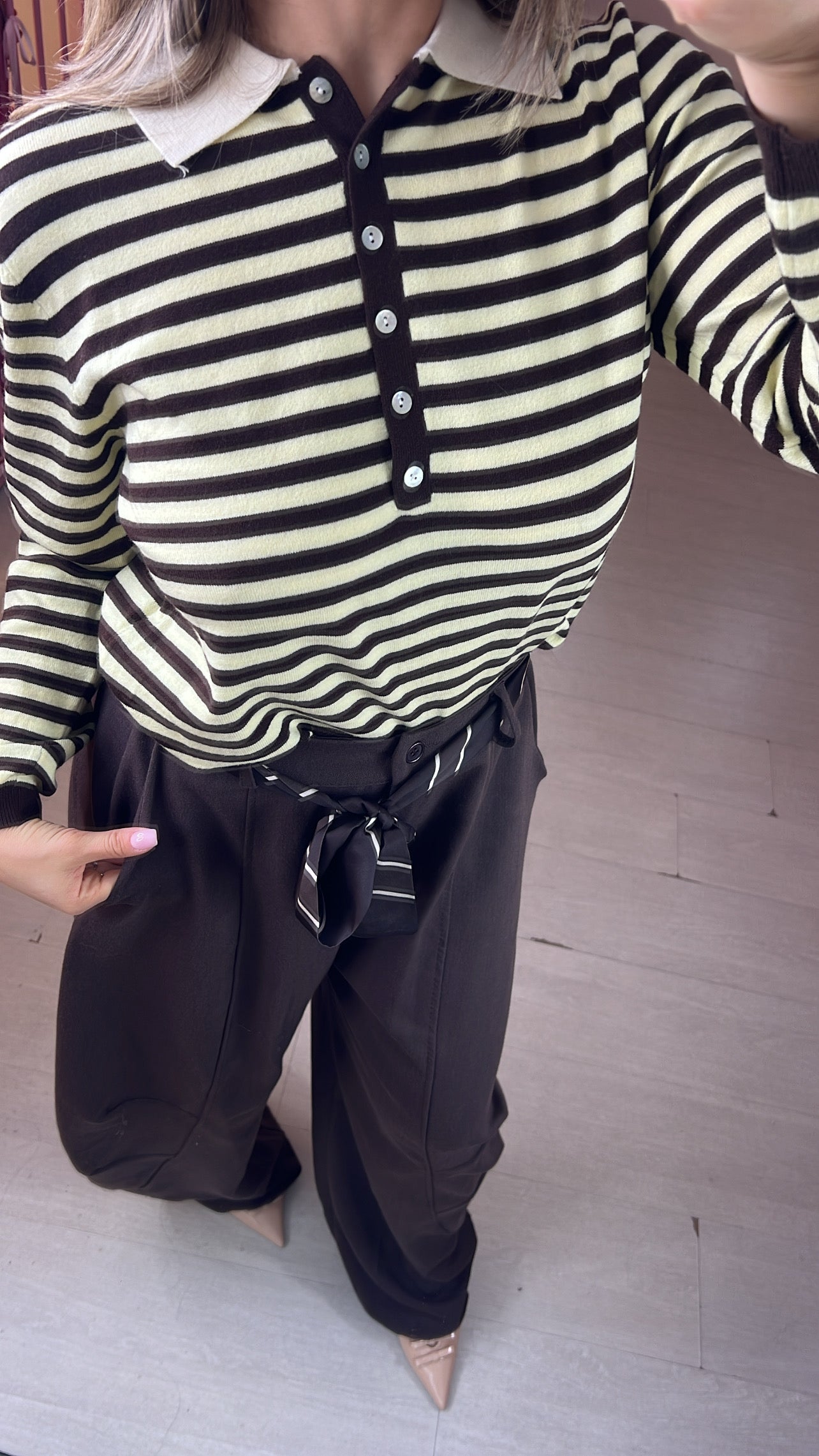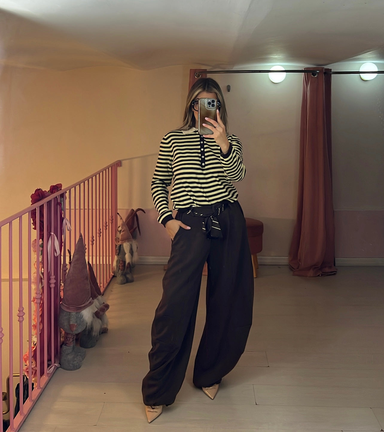 Pantalone marrone modello parachute con elastico coulisse parte della caviglia regolabile, cintina a bandana.