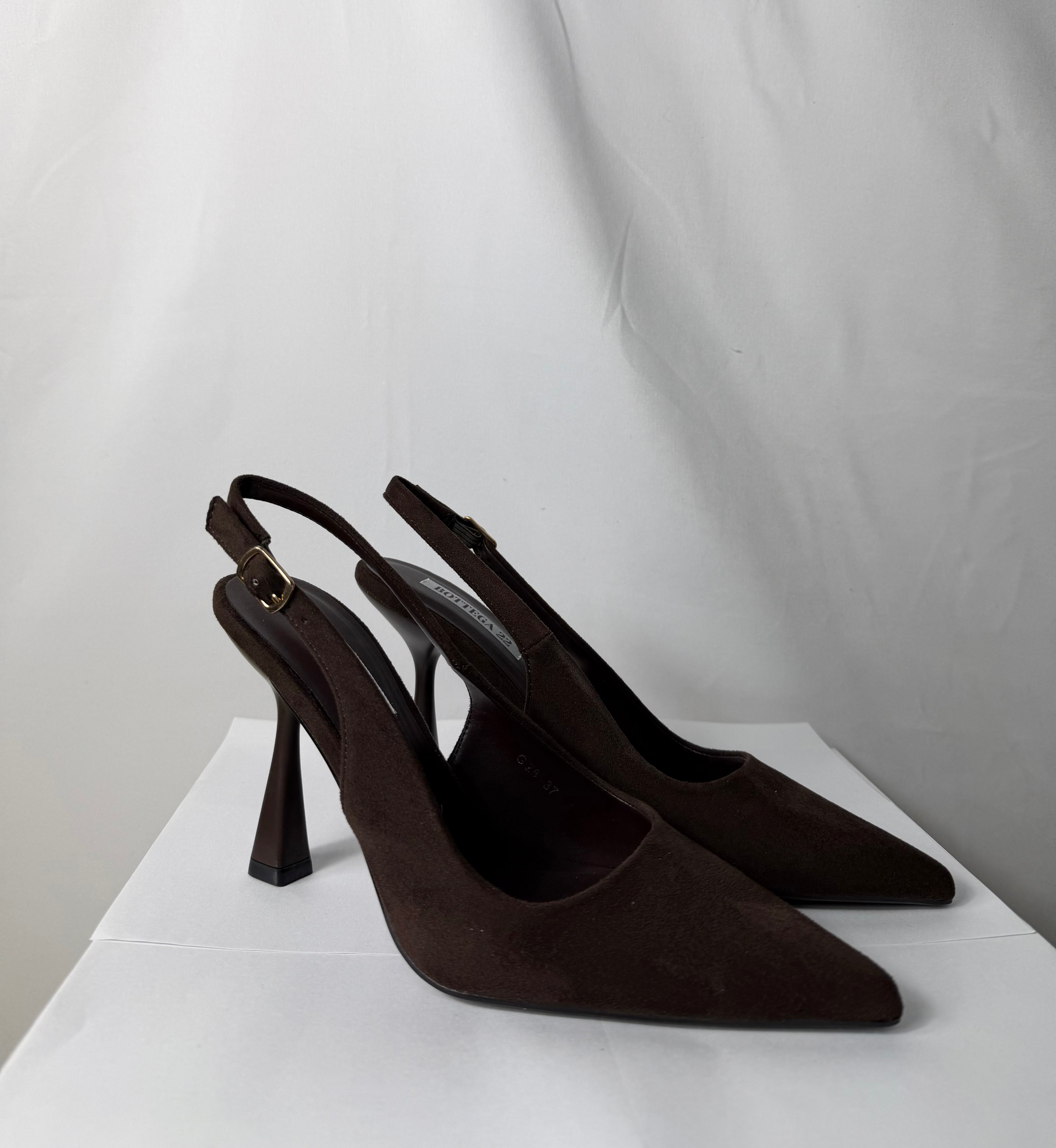 Décolleté slong back scamosciata marrone con cinturino posteriore .