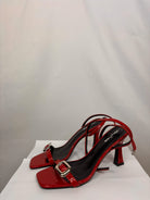 Sandalo rosso con fibbia argento e cinturino regolabile.