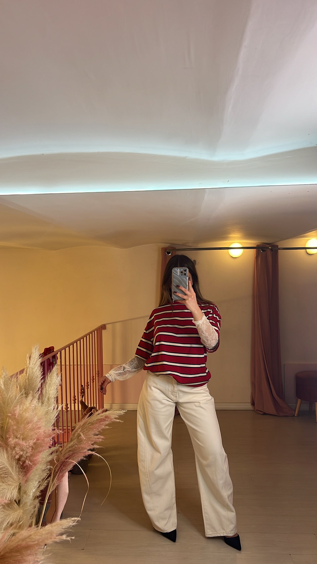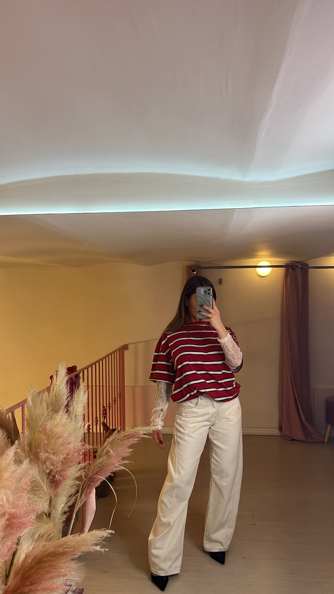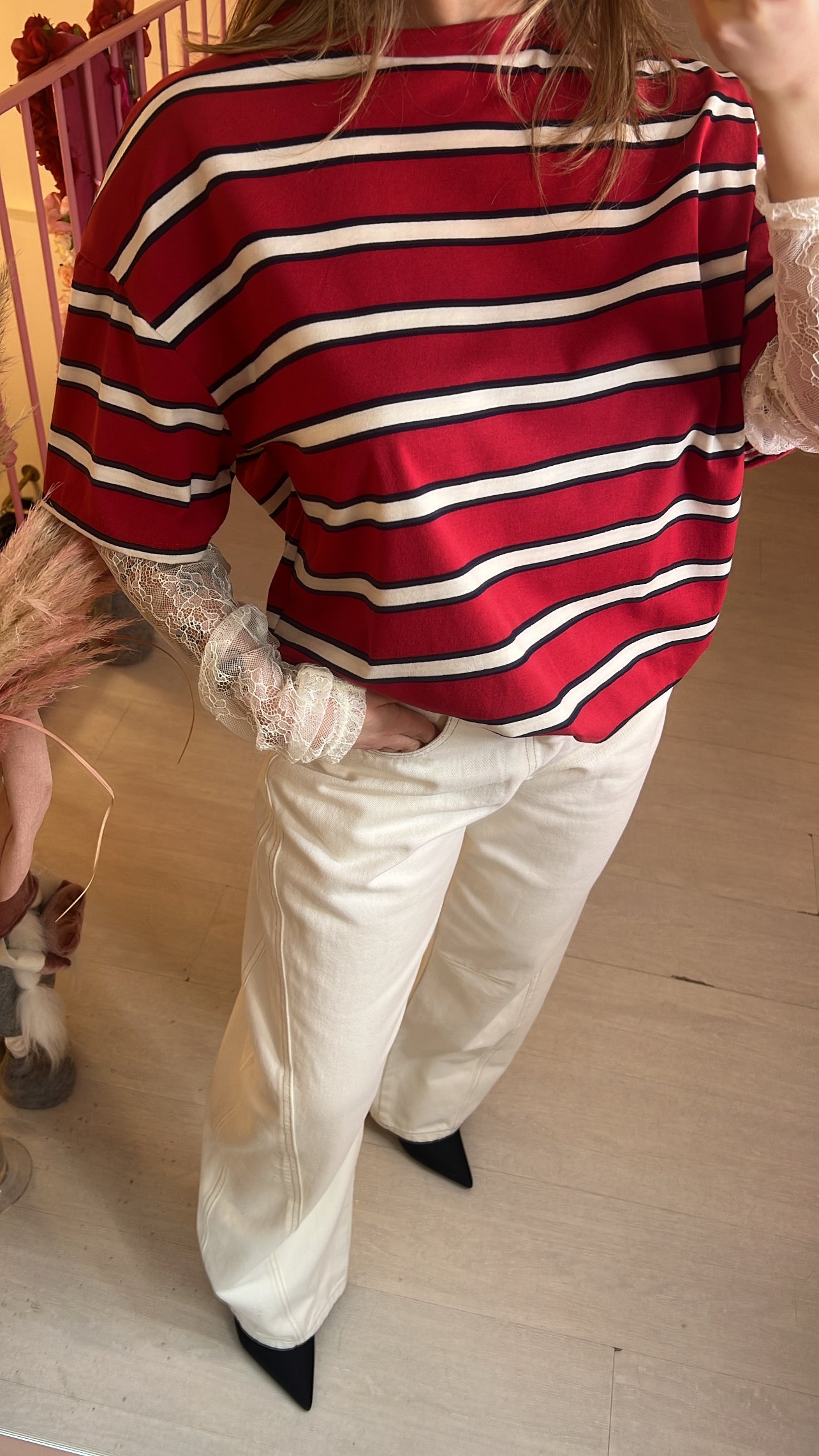 T-shirt oversize a righe con maniche in pizzo