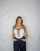 body con bretelline a colore contrasto, con fiocchetti e spacchi cut out.