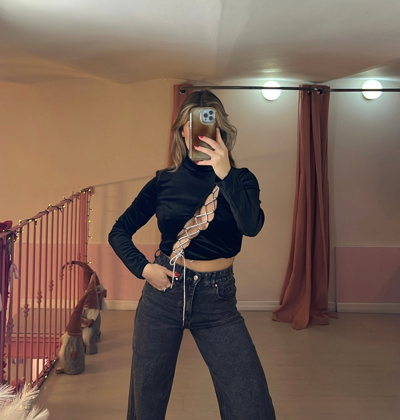 Top in velluto con lacci ad incrocio argento lurex