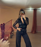 Body in ecopelle con zip frontale e maniche con trasparenza