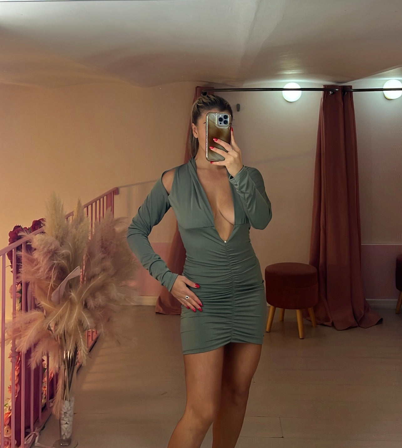 Abito con scollo a V, gonna arricciata e spallina spacco cut out.