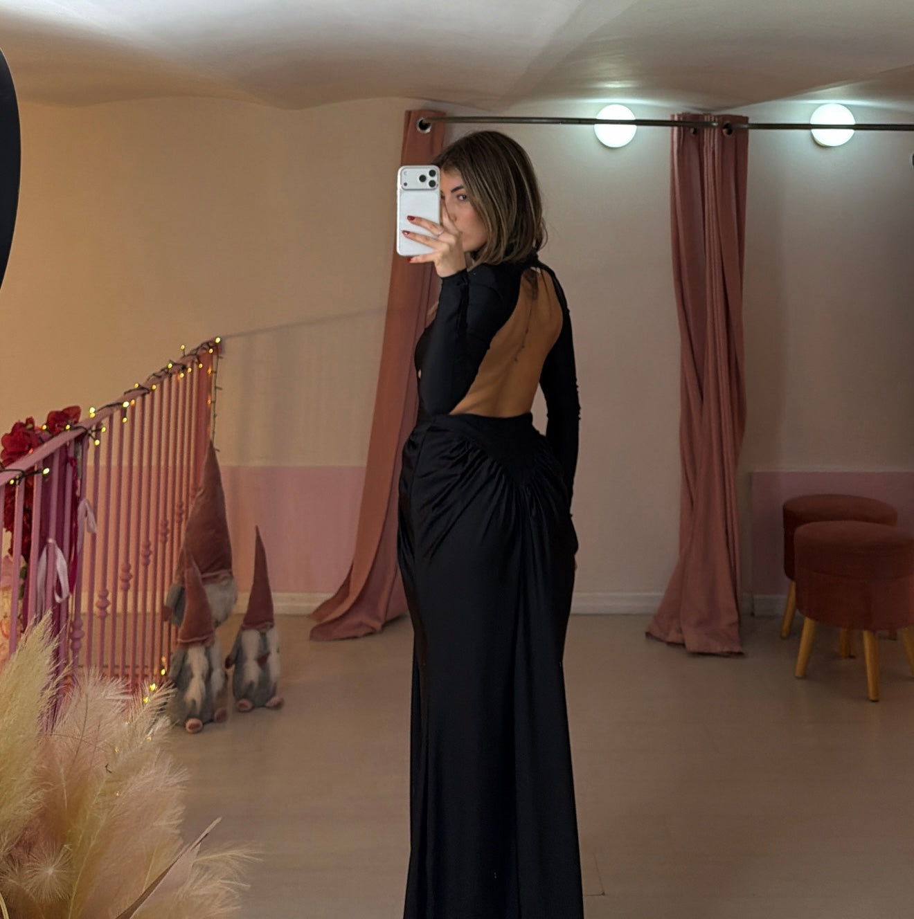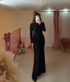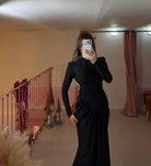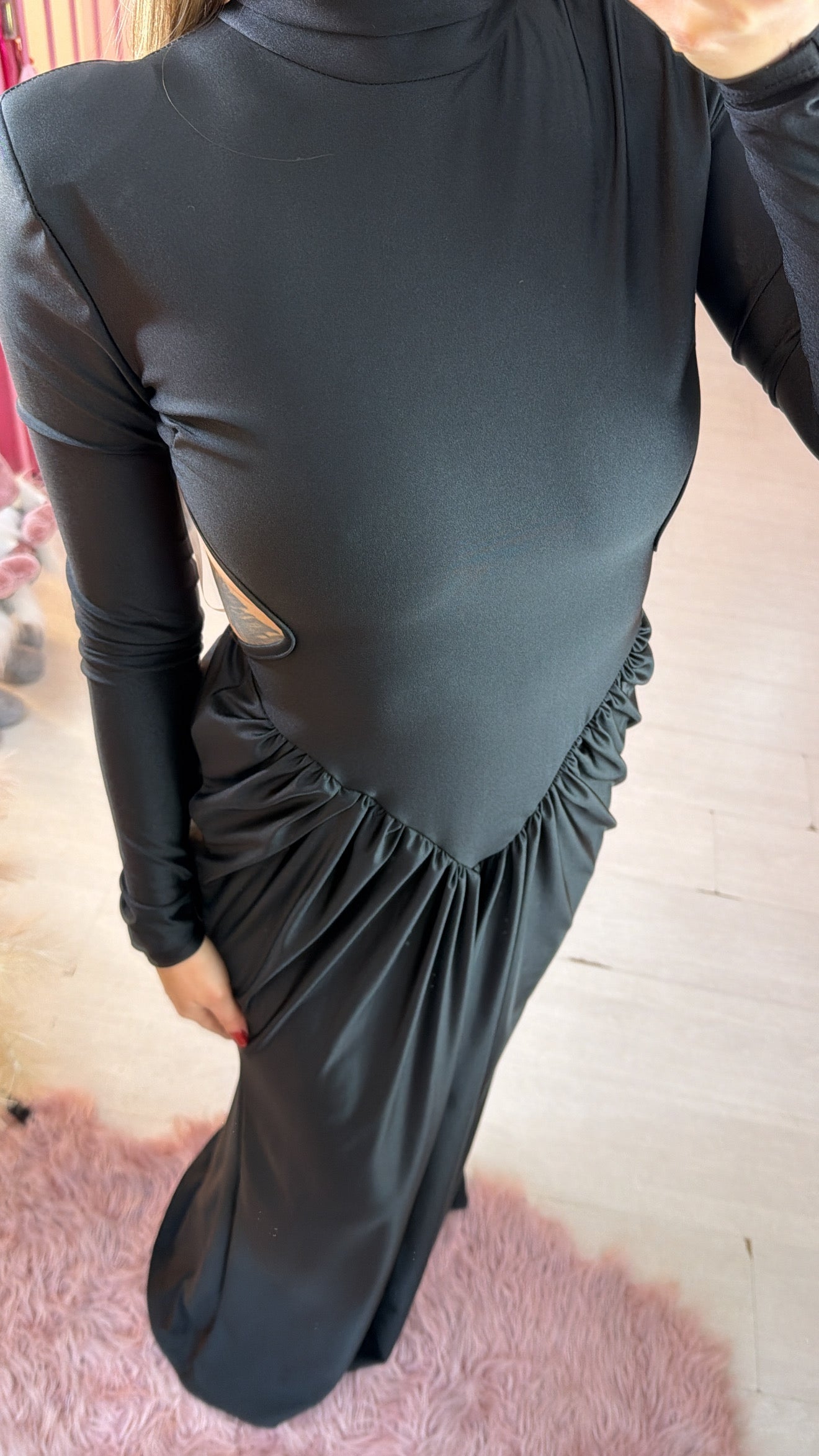 Abito lungo con drappeggio e arricciatura a V nella parte iniziale della gonna, scollatura profonda schiena.