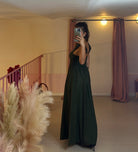 Abito lungo in pizzo sangallo con spacco frontale e bretellina rouches