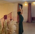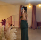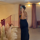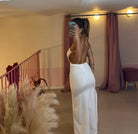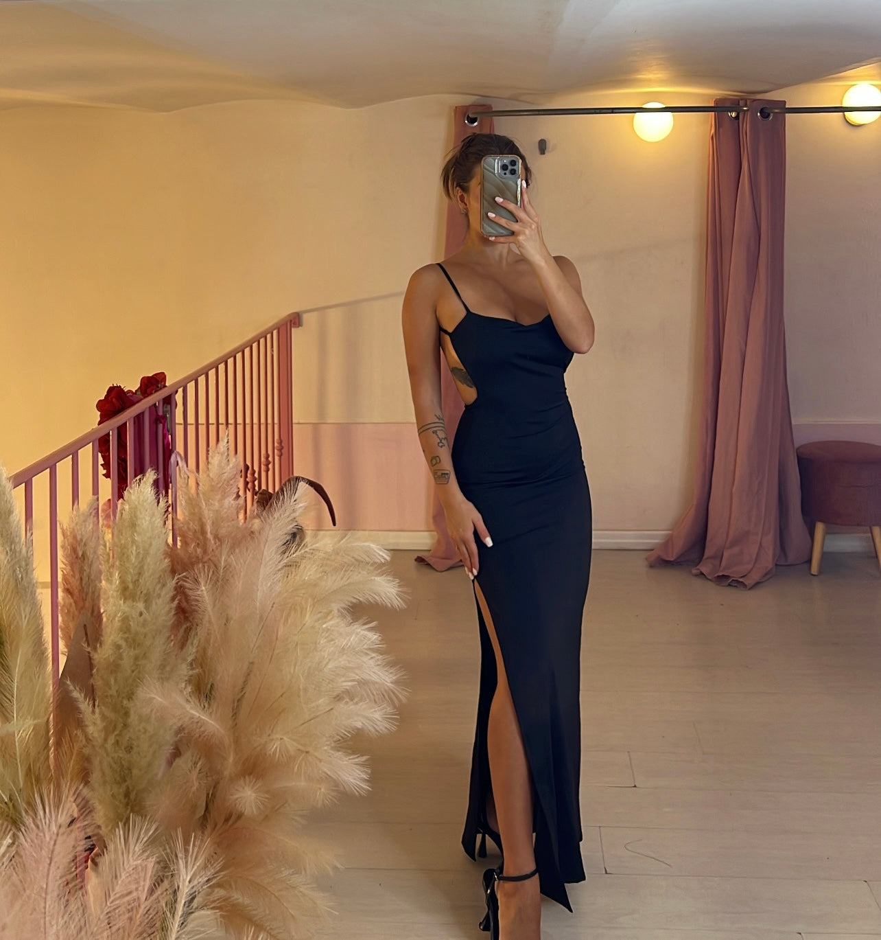 Abito longuette, scollo profondo sulla schiena con arricciatura e spacco laterale.