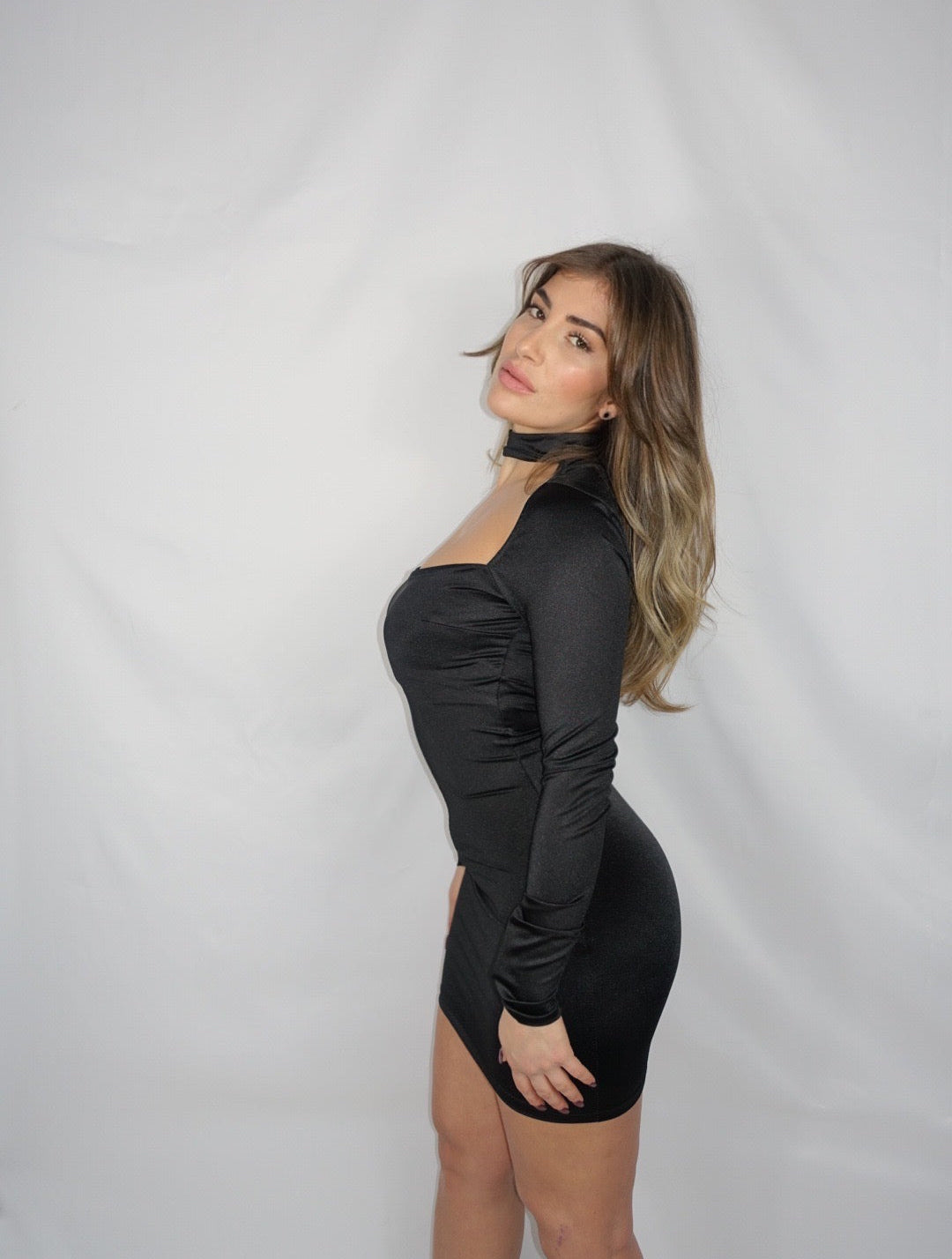 tubino nero effetto raso con scollo quadrato e collarino choker.