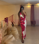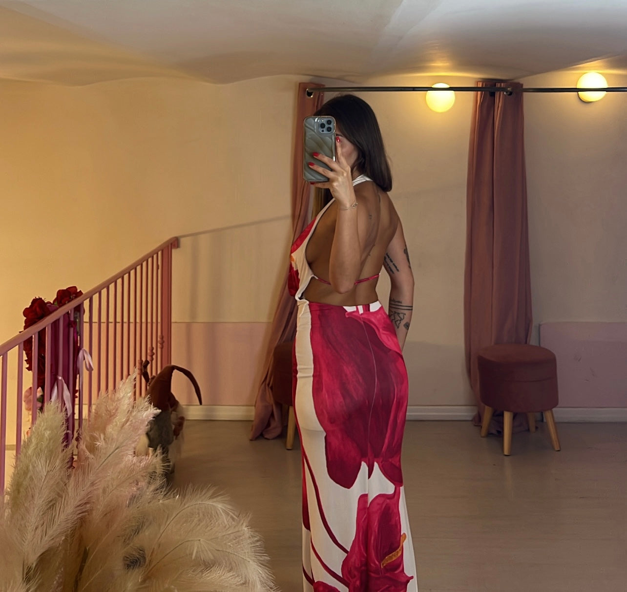 Abito lungo con scollo halter e schiena scoperta. Gonna morbida leggera con spacco laterale. Trama con fiore.