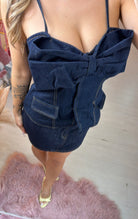 top in denim strutturato con fiocco nella parte avanti, spallina regolabile e chiusura zip nella parte retro.