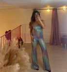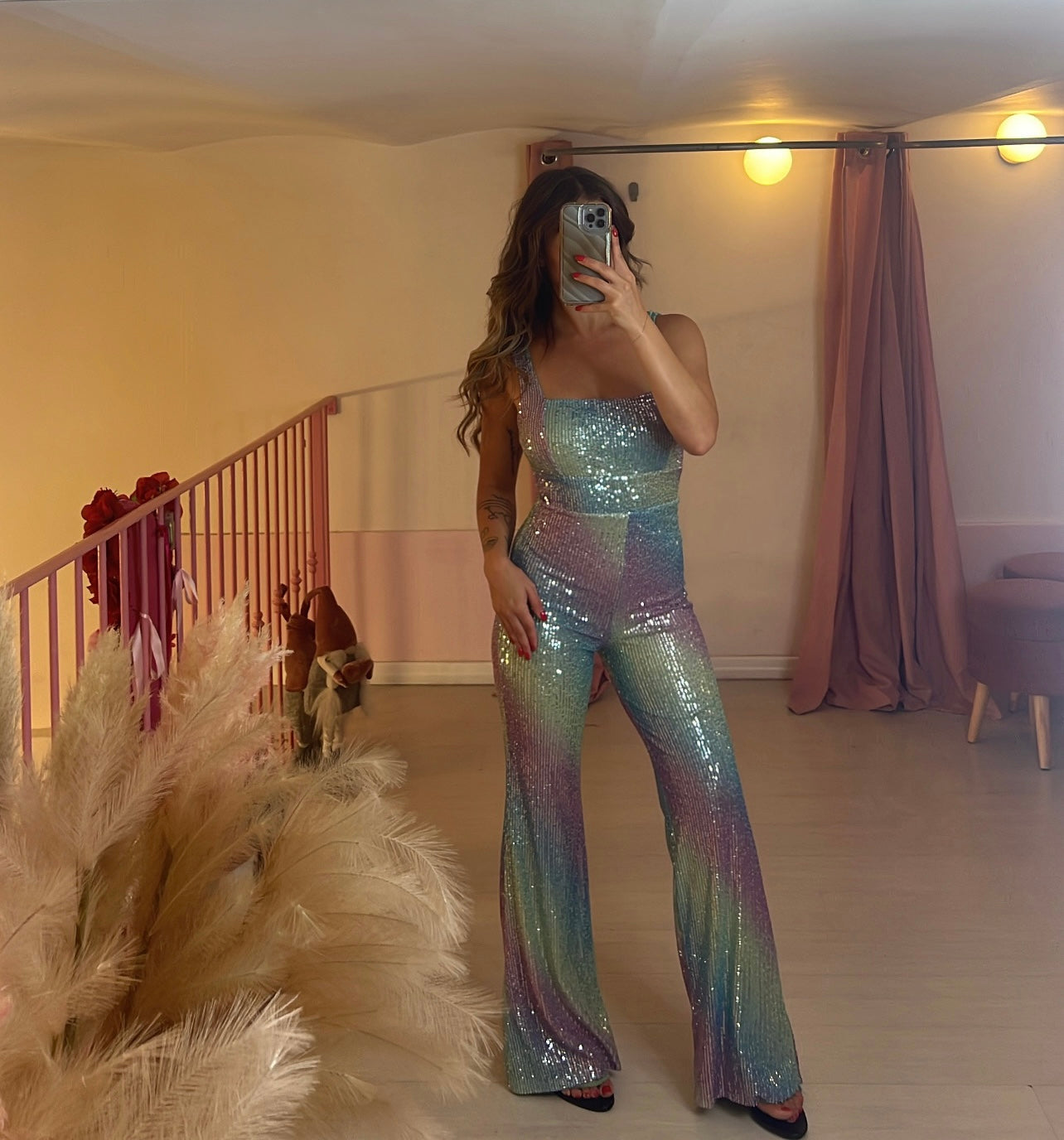 Tuta elegante con pantalone lungo, dettaglio fantasia multicolor e paillettes.