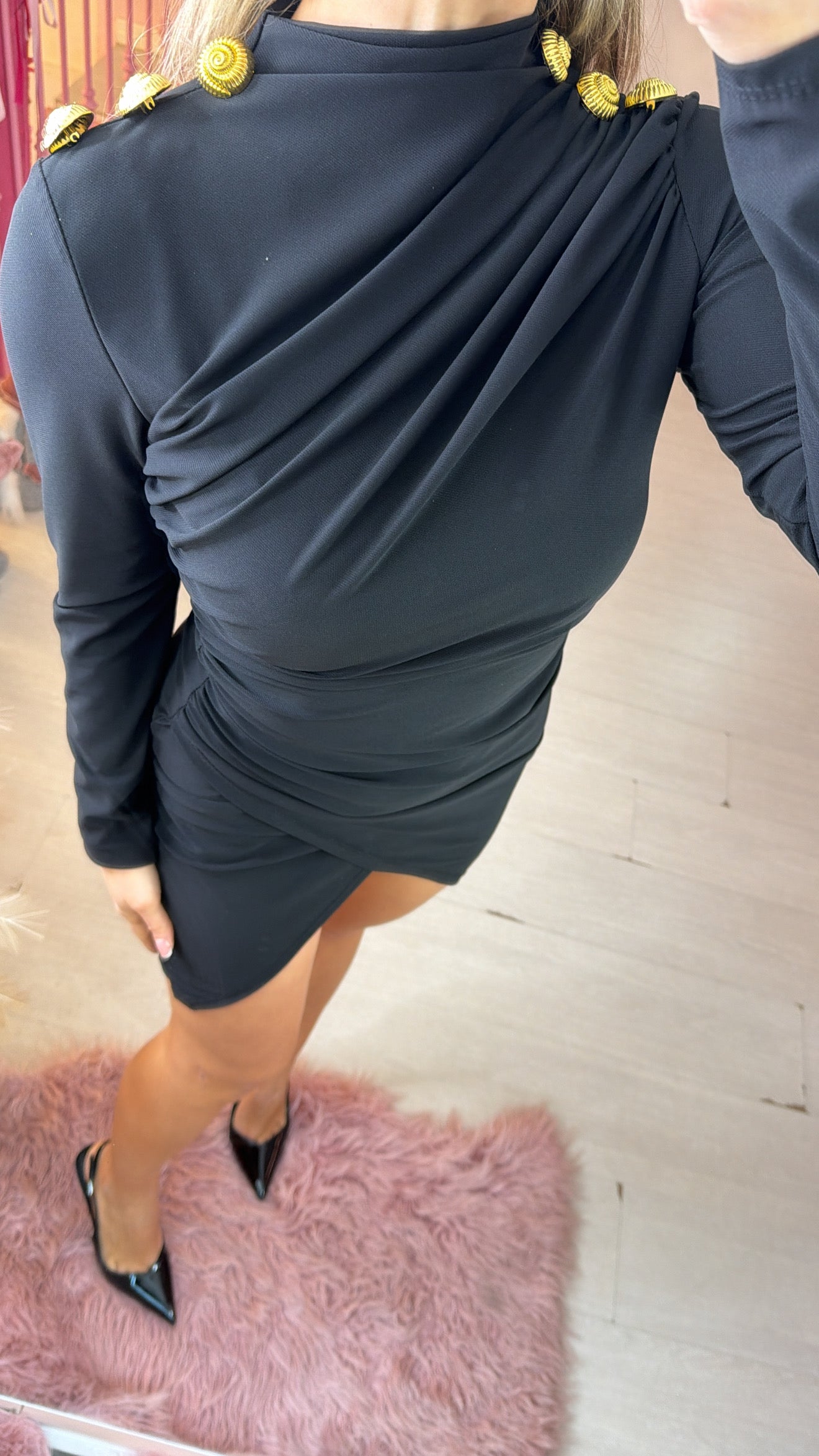 Vestito drappeggiato nella parte avanti con gonna spacco profondo a V e dettaglio gioiello oro sulla spallina.